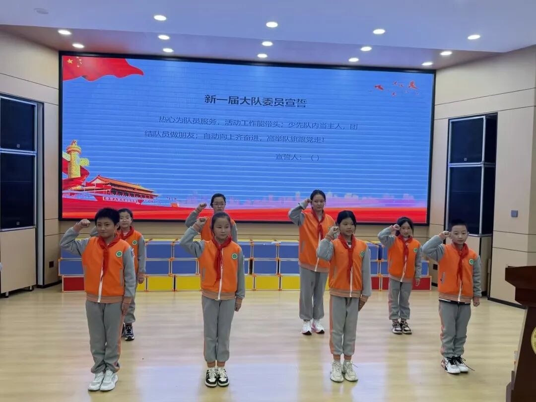 在鲜艳的队旗下,新一届大队委员高举右拳庄严宣誓,誓言铿锵、初心如磐,承诺将践行服务初心、团结伙伴共进,紧跟队旗砥砺前行。