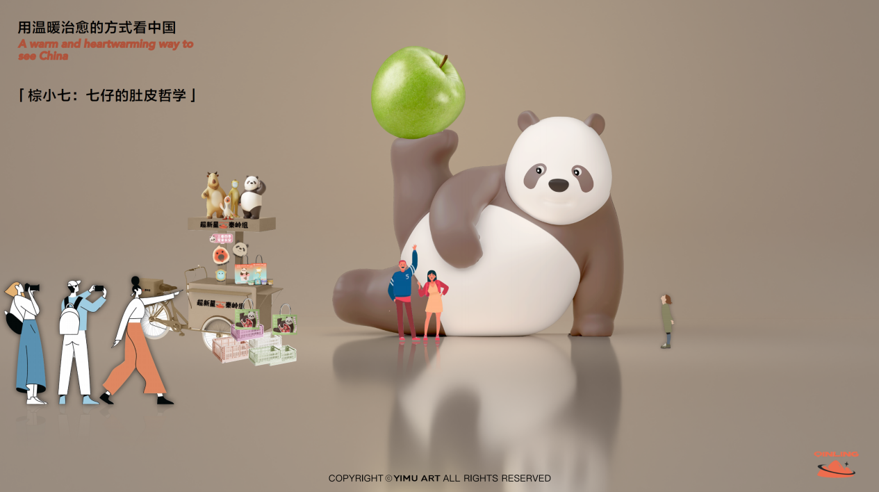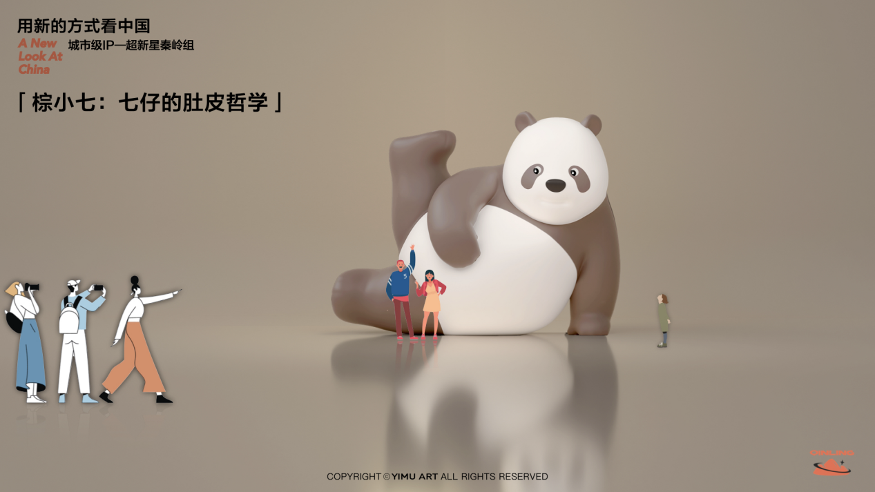 《棕小七:七仔的肚皮哲学》是以“全球唯一圈养的棕色熊猫”为原型创作的艺术IP形象棕小七的装置系列作品。也是黄飞春工作室创作的城市级艺术IP组合——《超新星秦岭组》形象之一。《超新星秦岭组》是以生活在中华祖脉秦岭的四个珍稀国宝动物“棕色大熊猫七仔、朱鹮、羚牛、金丝猴”为原型创作的IP形象组合。