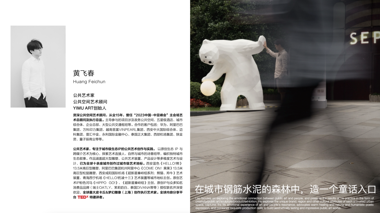 奕木艺术由公共艺术家黄飞春创立,其本人是资深公共空间艺术顾问,从业 15 年,曾任 “2023 中国 - 中亚峰会” 主会场艺术总顾问及执行总监,亦是阿里巴巴特邀合作艺术家,专注于城市级艺术 IP 的公共艺术创作与实践。