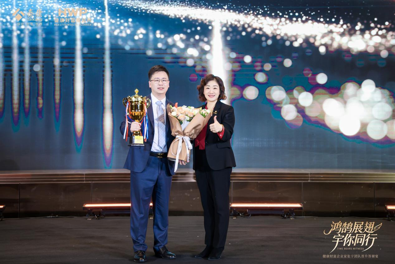 HWP健康财富企业家张宇登台分享成长历程,从加盟泰康到组建鸿鹄团队,从深耕业务到荣耀晋升,每一步都离不开平台的赋能与领导的期许。他深情致谢梁总的悉心栽培与泰康大平台的全方位支持,在泰康成立30周年的重要节点,寄语团队与公司携手迈向更辉煌的未来。梁总为其颁发荣誉奖杯与鲜花,在场嘉宾共同见证这一载入团队发展史的高光时刻。