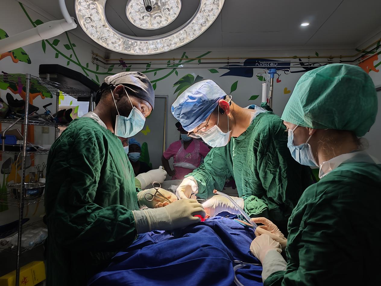 当地时间2025年10月23日,在充分进行术前评估与准备后,医疗队普通外科医生赵鹏靓主刀,麻醉医生任俊屹全程监护,医疗团队密切配合,顺利完成肿瘤切除。术后,患儿在医疗队与当地护理人员照护下恢复良好,术后第一天即正常排便,24小时内恢复经口喂养,第10天体重开始稳步增长。经过两周多的精心治疗与观察,患儿康复出院,回到母亲怀抱。