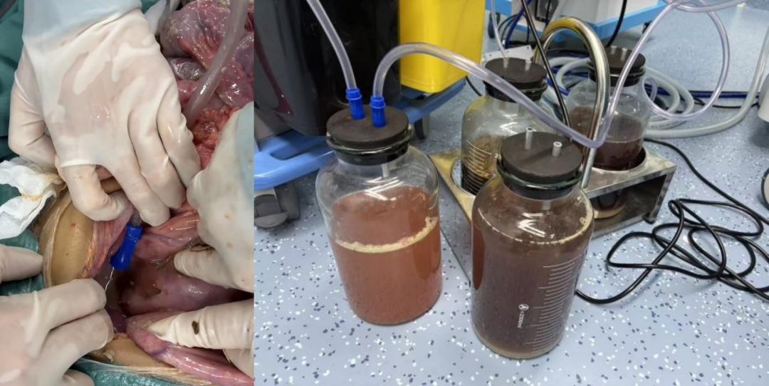 当晚,一场与死神赛跑的手术正式开始。当手术团队打开腹腔时,眼前的景象比预想的更为严重:腹腔内充满了大量绿色、散发着粪臭味的浑浊腹水及未消化食物,胃壁和肠壁上覆盖着厚厚的脓苔。胃因急性极度扩张,体积异常庞大,从膈肌一直延伸至盆腔。在胃底大弯侧前壁,一个长约2厘米的穿孔赫然在目,胃内容物正由此不断泄漏。手术团队迅速行动,经由穿孔处吸出的胃内容物总量竟高达约2500毫升!术中最终确诊为“胃壁坏死并穿孔、急性胃扩张、感染中毒性休克、肠粘连”。