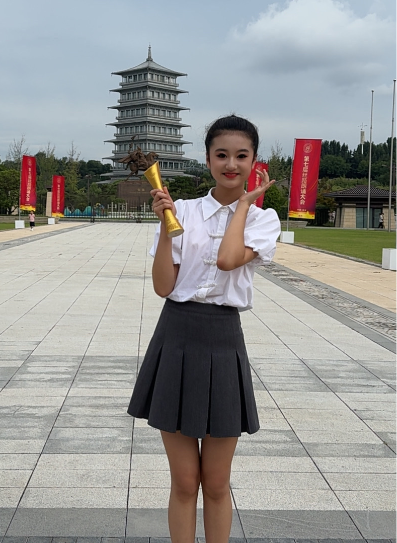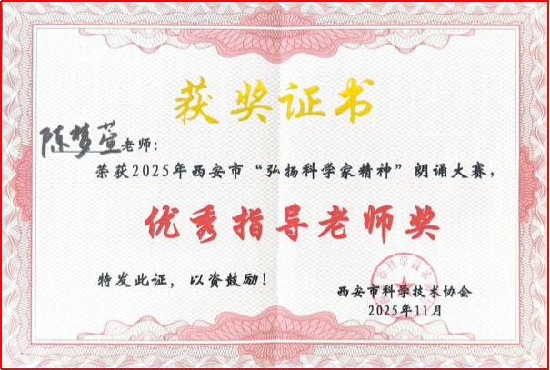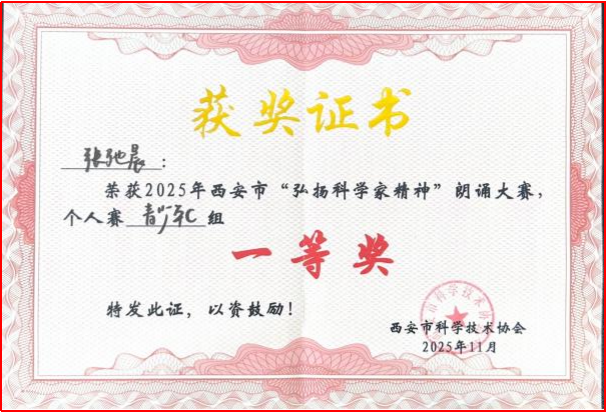 在2025年11月举办的西安市“弘扬科学家精神”朗诵大赛中,西安市五环中学初一(11)班张驰晨同学以娴熟的朗诵技巧、感人的朗诵内容和出色的舞台表现力折服全场,一举夺得个人赛青少年C组一等奖,指导老师陈梦萱荣获“优秀指导教师奖”。