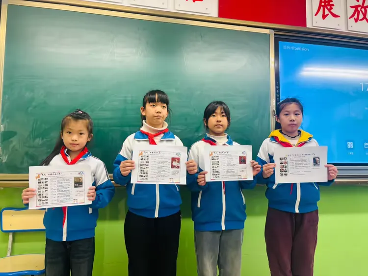 课堂上同学们精心梳理人物事迹,用清晰的图表、生动的文字记录杰出人物的爱国故事。一张张色彩斑澜的手抄报,将对先辈的敬意与对祖国的热爱,定格成鲜活的画面。