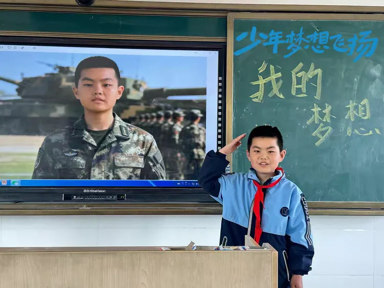 屏幕里的迷彩军装,是他眼里闪闪发亮的向往;黑板上的“少年梦想飞扬”,是此刻稚嫩却滚烫的信仰。红领巾系着当下的纯真,军礼敬向未来的模样——这一秒的他,把“长大要成为的人”,悄悄种在了课堂的阳光里。