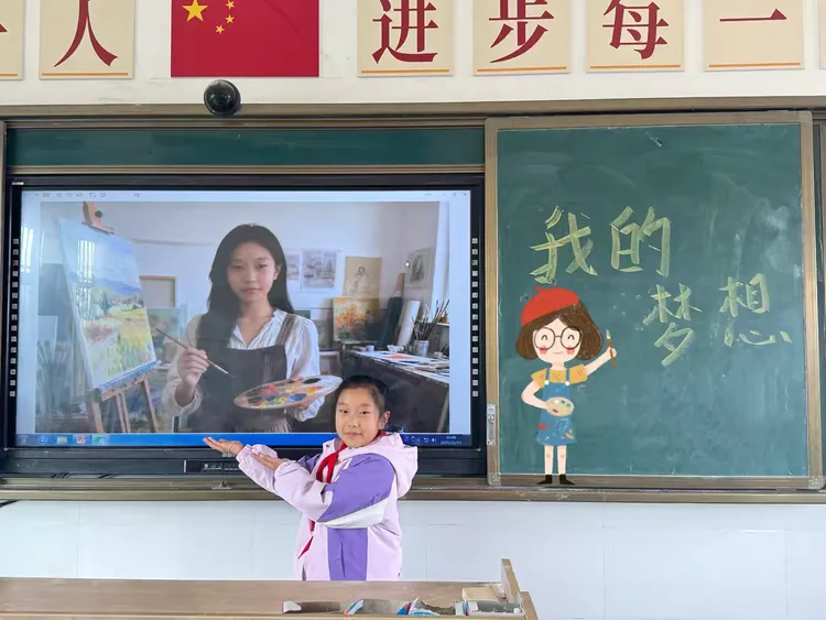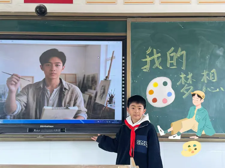 调色盘盛着斑斓的画,黑板上的卡通像举着画笔——她摊开的掌心,像托着一整个会发光的艺术梦。红领巾蹭着蓬松的衣摆,此刻的教室,连粉笔灰都裹着颜料的温柔,把“想成为画家”的心愿,轻轻种在了少年的眼底。
