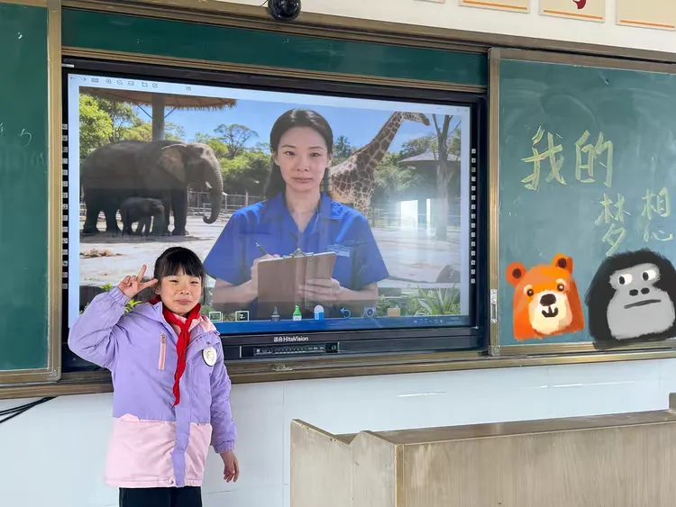 热带的雨林风裹着象群的呼吸,蓝工装捧着动物们的秘密;把自然的温柔,别在了红领巾角。光落在紫粉衣摆上,此刻的心愿,是让长颈鹿的颈弯、小象的鼻息,都成为她长大后掌心的温度——这一秒的孩子,正把“想做动物守护者”的梦,种进了每片绿叶的光影里。