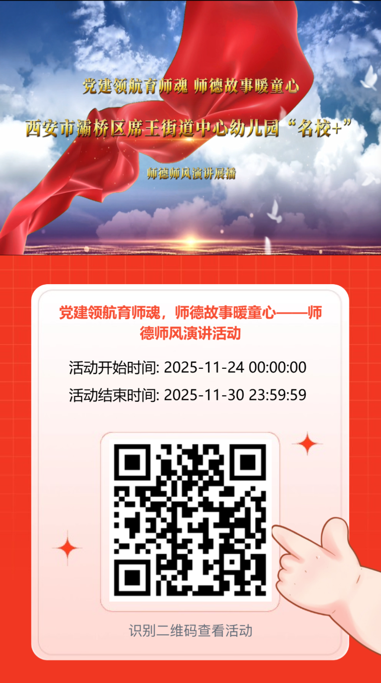在党建引领下,将师德师风建设、清廉学校建设与党组织建设深度融合,以弘扬高尚师德师风、涵养清廉从教风尚为核心,立足幼儿园教育教学实际。西安市灞桥区席王街道中心幼儿园“名校+”通过组织党员教师带头分享、全体教师参与的师德故事分享活动,挖掘身边党员教师及普通教师的师德榜样事迹与清廉从教案例,进行为期一周的师德师风故事线上投票评选活动。