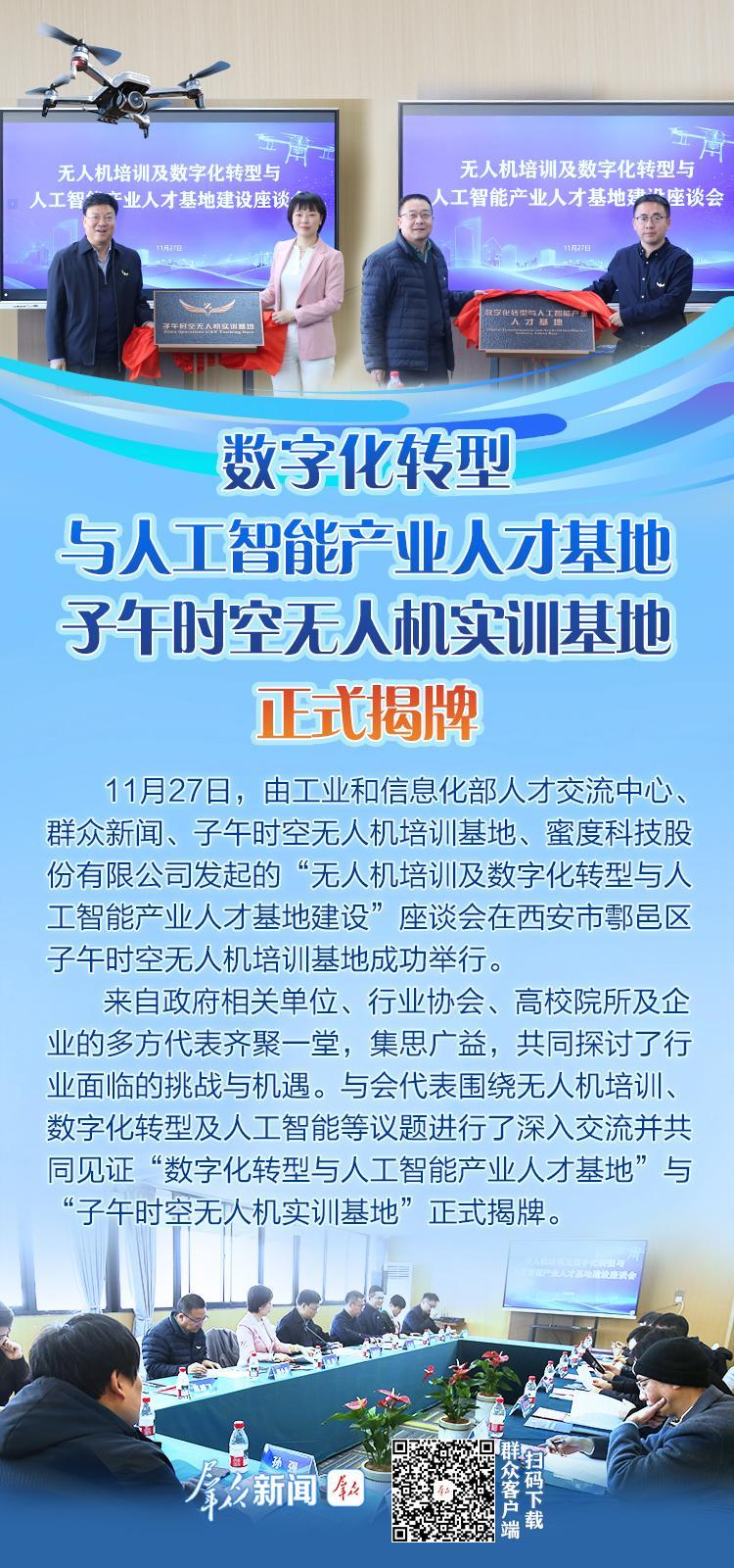 11月27日,由工业和信息化部人才交流中心、群众新闻、子午时空无人机培训基地、蜜度科技股份有限公司发起的“无人机培训及数字化转型与人工智能产业人才基地建设”座谈会在西安市鄠邑区子午时空无人机培训基地成功举行。