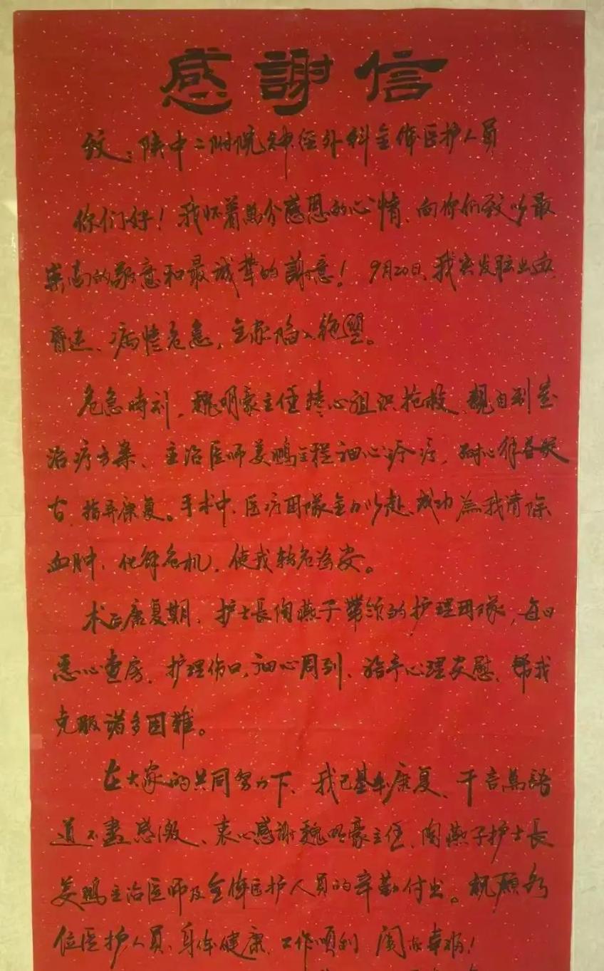 近日,陕西中医药大学第二附属医院神经外科病房里暖意融融,即将出院的患者及家属将两面饱含敬意的锦旗、一封情真意切的感谢信和一束鲜丽的鲜花送到医护人员手中,再三表达对团队全力以赴救治、精心护理的感激之情。
