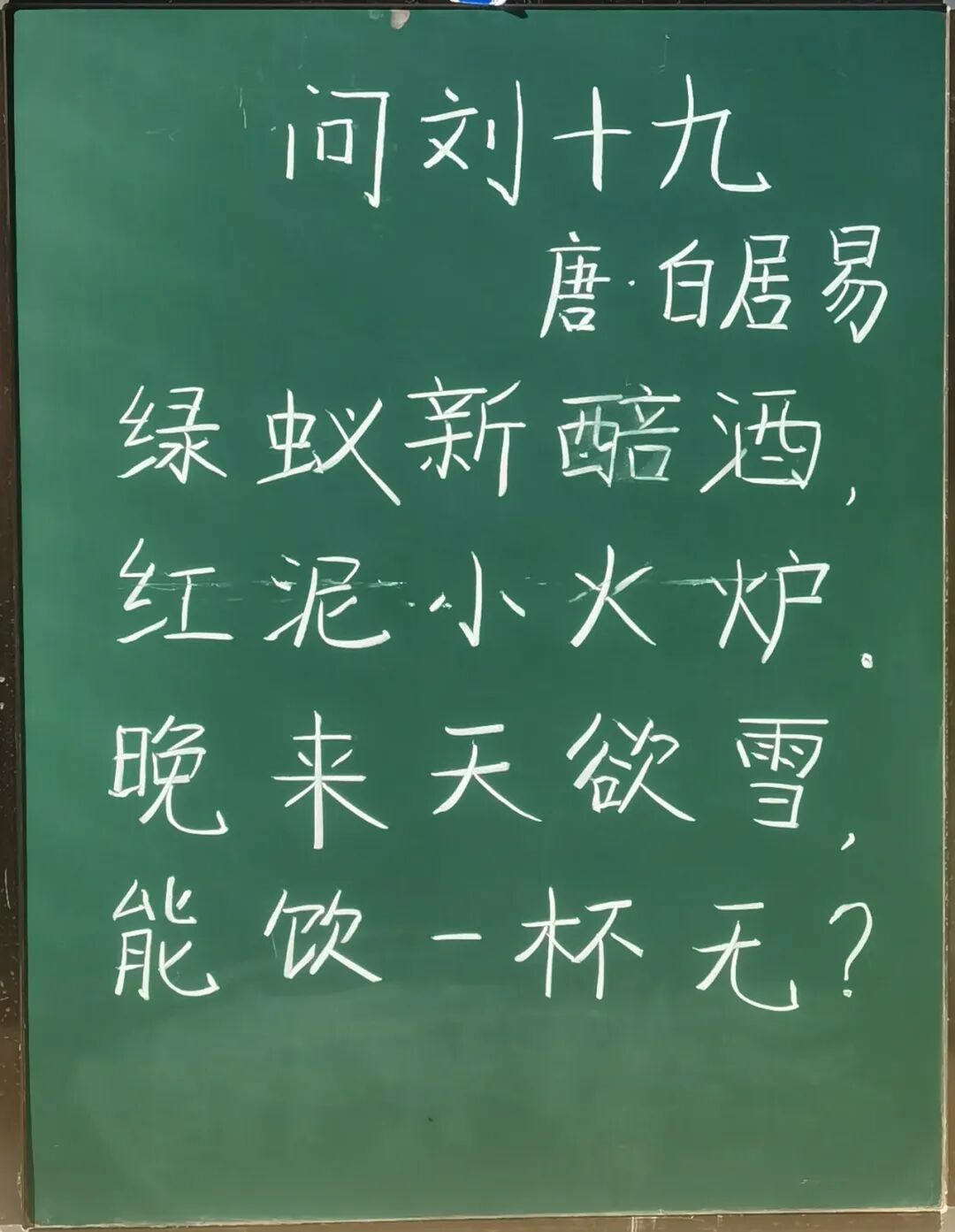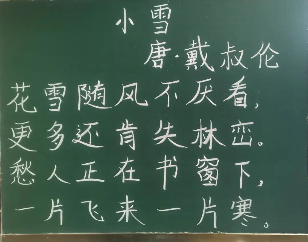 黑板画与粉笔字展示区成为活动的“文化风景线”。青年教师们以粉为墨、以板为纸,将“小雪”的意境跃然板上:有的勾勒出“千树万树梨花开”的素白雪景,枝桠间落雪点点,墙角红梅点缀其间;有的描绘孩童围炉赏雪、堆雪人的温馨场景,笔触细腻充满童趣。粉笔字作品则尽显书法功底,楷书端正秀丽,行书流畅灵动,老师们或书写“小雪”节气谚语“小雪至,冬伊始”,或摘录诗词“应是天仙狂醉,乱把白云揉碎”,一笔一划间,既展现了汉字的韵律之美,也让传统节气知识通过笔墨传递给每一位师生。