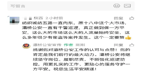 群众的认可与心声,是灞桥公安前行的不竭动力。下一步,灞桥警方将始终以群众需求为导向,精准聚焦重点时段、薄弱区域,动态优化巡逻方案与警力部署,不断完善“全时段、多维度、精准化”的立体化巡逻防控体系,用实实在在的安全成效让群众的安全感、幸福感、获得感持续升温。