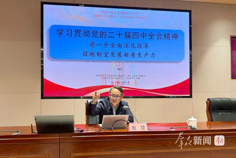 讲座开始前,大家首先观看了中国人民大学“陕公大学堂”的宣传视频。接着,中国人民大学应用经济学院院长、和平与发展学院院长魏楚以“学习贯彻党的二十届四中全会精神 进一步全面深化改革 因地制宜发展新质生产力”为题展开讲座。