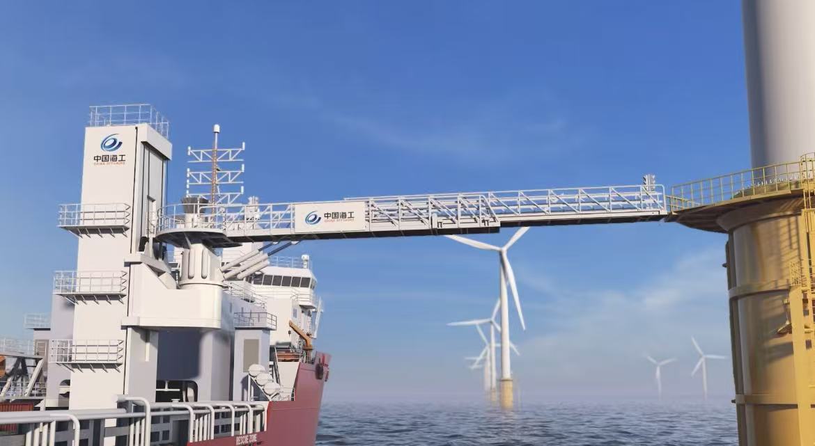 “深海祥云”—26米智能型主动波浪补偿栈桥,凭借领先的主动波浪补偿技术与智能顶靠/对接系统,对波浪运动引起的工作母船升沉运动进行补偿,有效保持了栈桥末端与海上设施之间的相对稳定,实现5 级海况下海上风电、钻井平台、海上浮式储油装置(FPSO)、海上补给基地稳定衔接,解决了制约深远海风电运维“作业窗口期短”等一系列难题,提升了深海作业的安全效率,攻克了恶劣海况下远海拓展作业平台对接这一关键瓶颈,有望成为我国海洋工程领域发展新质生产力的标志性装置和明星产品。该产品是宝石机械深入实施创新驱动发展战略,在深海油气勘探关键核心技术装备研制领域取得又一重大突破!