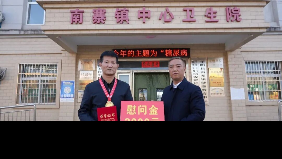 阳光讯(记者 张伟 芮扬)11月27日,千阳县委常委、政法委书记张利强代表宝鸡市“见义勇为”基金会,将“见义勇为人物”荣誉证书和2000元慰问金,送到了南寨镇中心卫生院院长冯成财手中。