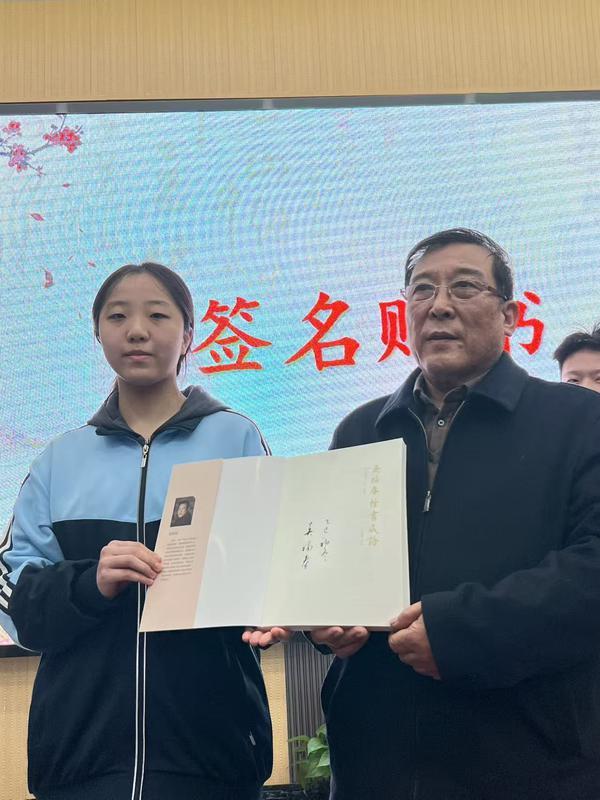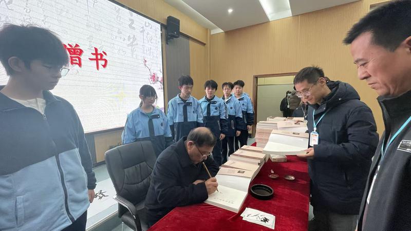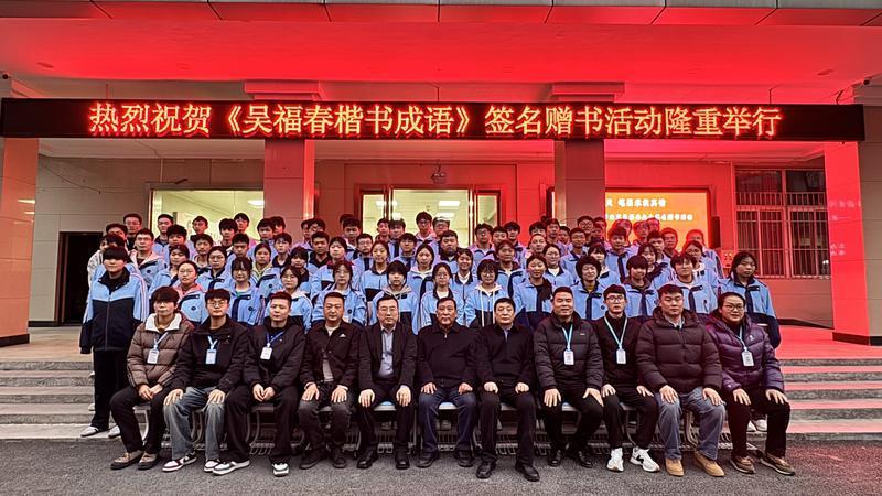 签名赠书环节,吴福春将凝聚多年创作心得与人生智慧的著作逐一签名赠予现场师生,墨香与书香交织,浸润着每个人的心灵。他还挥毫写下“积学储宝”“见贤思齐”等励志书法作品,勉励学生们胸怀壮志,逐梦前行。