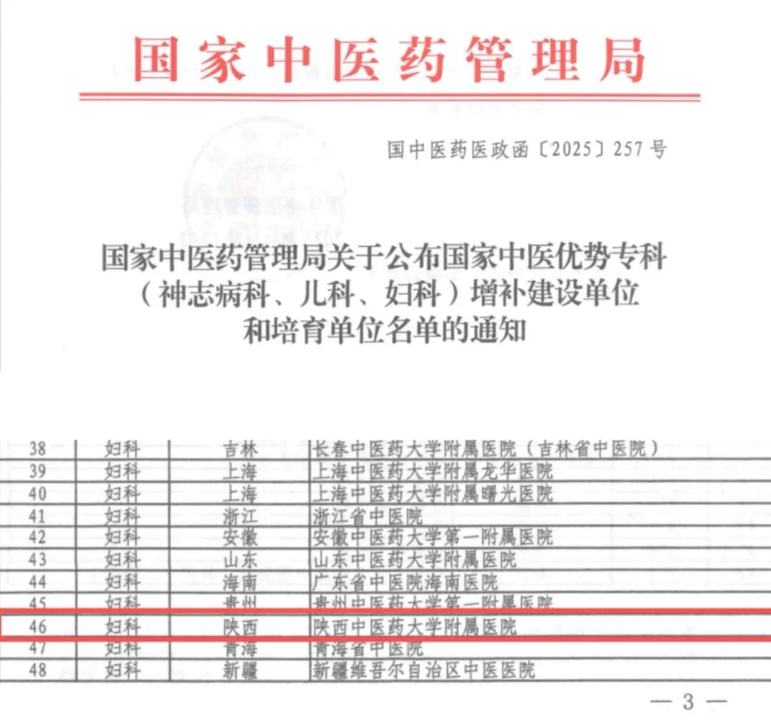 近日,国家中医药管理局正式印发《关于公布国家中医优势专科(神志病科、儿科、妇科)增补建设单位和培育单位名单的通知》(国中医药医政函〔2025〕257 号)。经过国家层面的层层严苛遴选与权威评审,陕西中医药大学附属医院妇科凭借深厚的中医传承底蕴、鲜明的中西融合诊疗特色、卓越的临床疗效及雄厚的学科综合实力,成功入选“国家中医优势专科”增补建设单位,正式跻身全国中医妇科“国家队”行列,成为医院学科建设史上又一里程碑式成就!