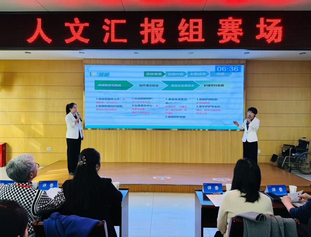 赛事设“人文汇报组”与“人文综合组”两个赛道。咸阳市中心医院肿瘤中心一病区及安宁病区护士长张婉、省级安宁疗护专科护士陈荣,以“对话+情景”的创新形式进行汇报,凭借《悦享安宁,人文相伴——基于全程管理模式下人文护理在肿瘤及安宁患者中的应用》案例在8分钟时间内,通过清晰的逻辑、扎实的数据和真挚的情感,生动展现了医院在肿瘤及安宁疗护领域的人文实践,赢得了评委的一致认可。