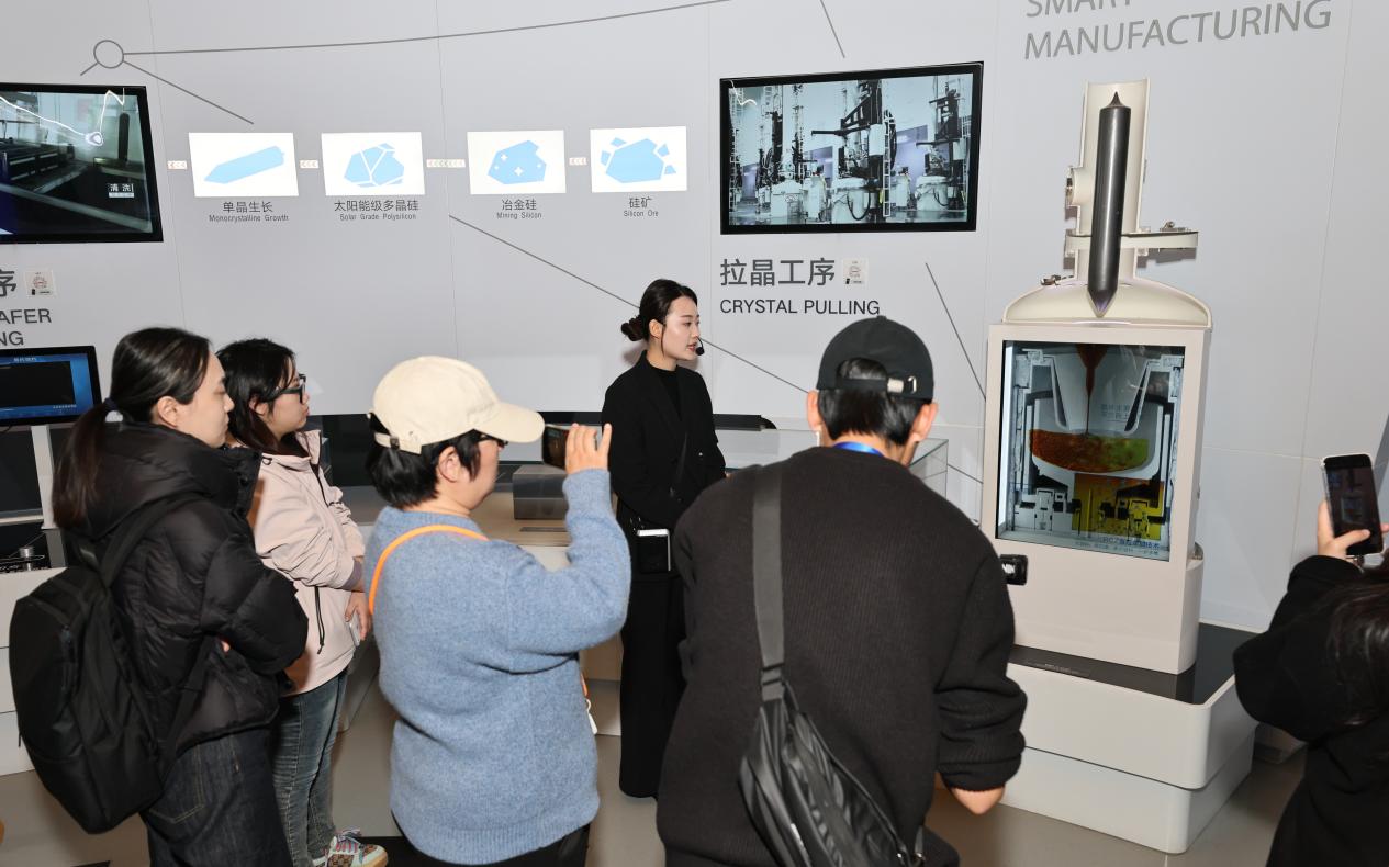 在智能制造板块,单晶炉模型与演示动画生动呈现了单晶硅棒的制备过程:多晶硅料在1450℃以上高温中熔化,再通过特定工艺成型。讲解员告诉记者:“过去在我们的拉晶工厂,一个单晶炉一次只能拉出一根3—5米长的单晶硅棒,需要40个小时,并且废料直接丢弃,比较浪费。我们通过不断的技术革新,RCZ拉晶技术可以在一次生产过程当中进行多次加料,现在一个单晶炉可以一次连续拉出10根左右5米长的单晶硅棒,废料也可以回炉重拉,这样极大地提高了生产效率,降低了生产成本。”