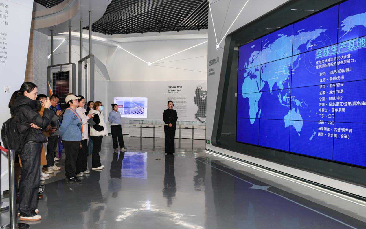 “太阳每秒钟照射到地球上的能量相当于500万吨煤炭所燃烧的能量,而太阳一年到达地球上的光照能量,则大于地球上所有其他类型能源加在一起的能量总和。我们只需要利用地球上1%的荒漠面积进行光伏发电,就可以满足全人类的用电使用。”展厅讲解员带大家了解能源变迁和光伏原理后,以一组数据开启隆基绿能企业故事讲解:2000年公司成立后专注半导体技术,2006年选定单晶技术路线并完成多项产业革命,2014年进军产业链中下游、在海外多地建立生产基地,2018年成为全球光伏行业市值最高企业,2021年隆基氢能成立开启能源新赛道,2022年打破单晶硅电池转换效率世界纪录,2025年4月将该纪录刷新,隆基绿能自主研发的晶硅-钙钛矿两端叠层太阳电池转换效率达到34.85%……“隆基绿能始终以技术革新为引擎,推动行业向前。”讲解员总结道。