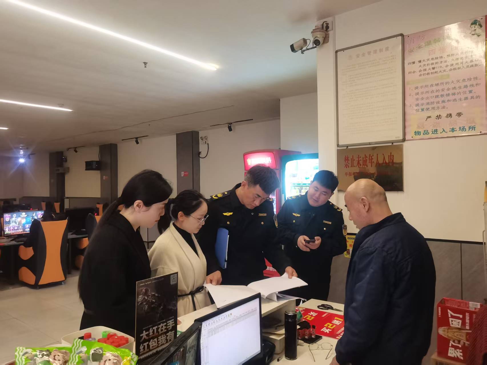 紧盯文化娱乐场所,筑牢规范经营防线。聚焦网吧未成年人准入管理,对辖区内5家网吧进行全覆盖检查,通过抽查上网人员有效身份证件核验情况,刚性落实《中华人民共和国未成年人保护法》相关要求;严格审核歌舞娱乐场所曲库来源及内容,全面清查违禁歌曲,倡导绿色健康消费,切实保障消费者合法权益;深入排查游艺娱乐场所设备合格证有效性及礼品奖励机制合规性,严厉打击游艺积分非法兑换等违规行为。同时,逐项核查场所内“证照墙”公示、举报电话张贴、未成年人禁入标识、禁烟标识、安全通道标识等硬性要求落实情况,确保规范经营全覆盖、无死角。