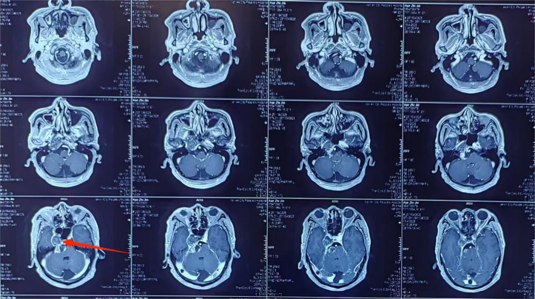 患者薛大爷(化名)一年前便出现右侧听力下降、面瘫以及右眼不能外展等症状。在外院进行头颅磁共振检查后,被考虑为右侧桥小脑角占位。由于该占位毗邻脑干,手术风险极高,家属出于安全考虑,仅让薛大爷接受了放射治疗。然而,一周前,薛大爷突发恶心呕吐,遂来到西安市第九医院神经外科二病区就诊。