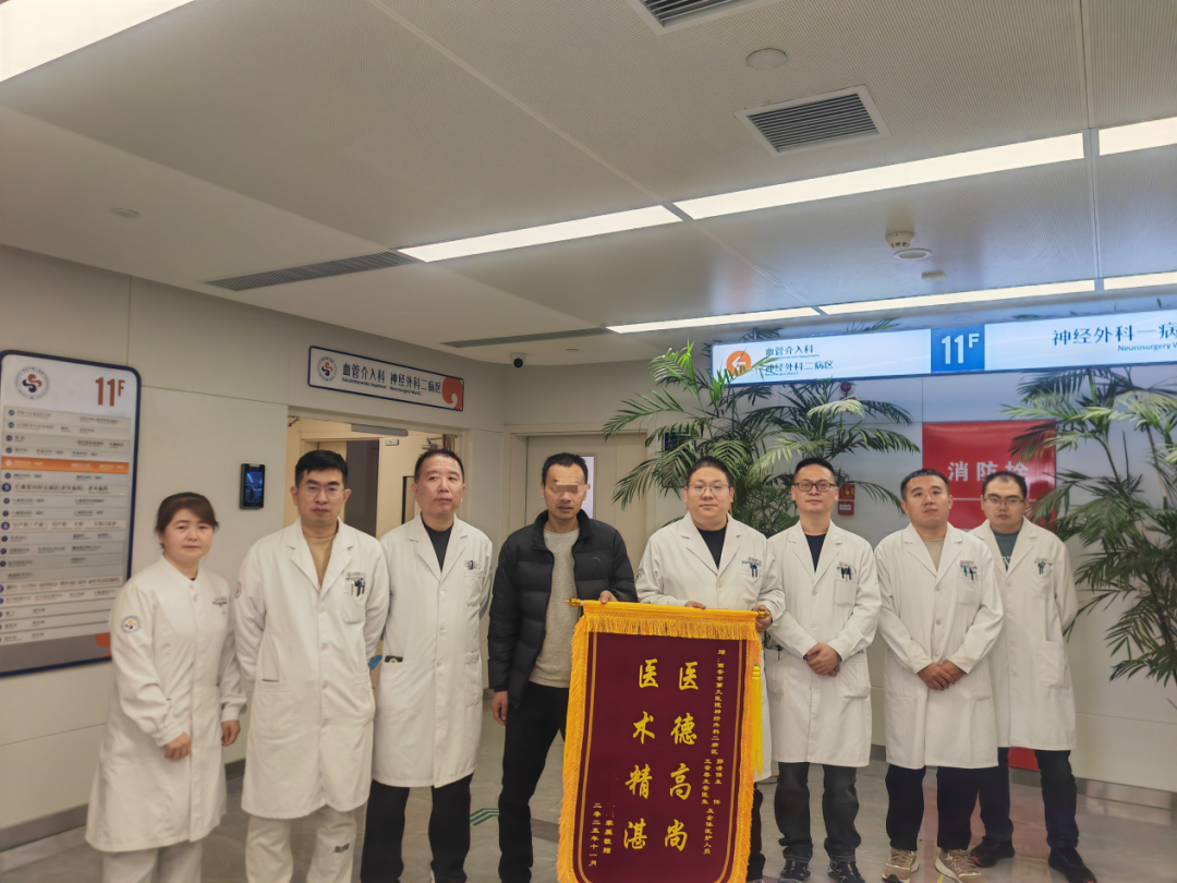 对于科室医护人员的全力照护,薛大爷及其家属感激不已。为了表达这份诚挚的谢意,他们特意向郭清保主任及其团队赠送了锦旗。这面锦旗,不仅是对医护人员辛勤付出的肯定,更是医患之间深厚情谊的见证。西安市第九医院神经外科二病区用实际行动诠释了“医者仁心”的深刻内涵,为更多患者带来了生命的希望。