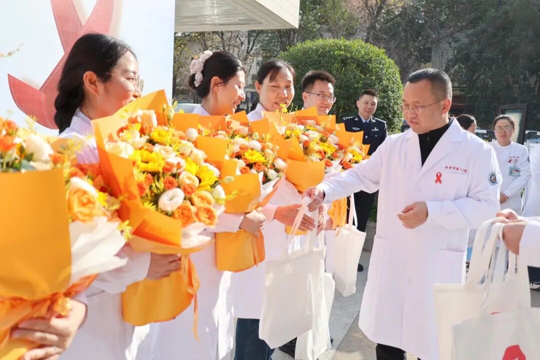 李院长在讲话中总结了医院在抗病毒诊疗、服务优化等方面的成效,呼吁全社会凝聚防艾合力。随后,院领导为一线医护人员代表献上鲜花,向他们致以诚挚慰问。