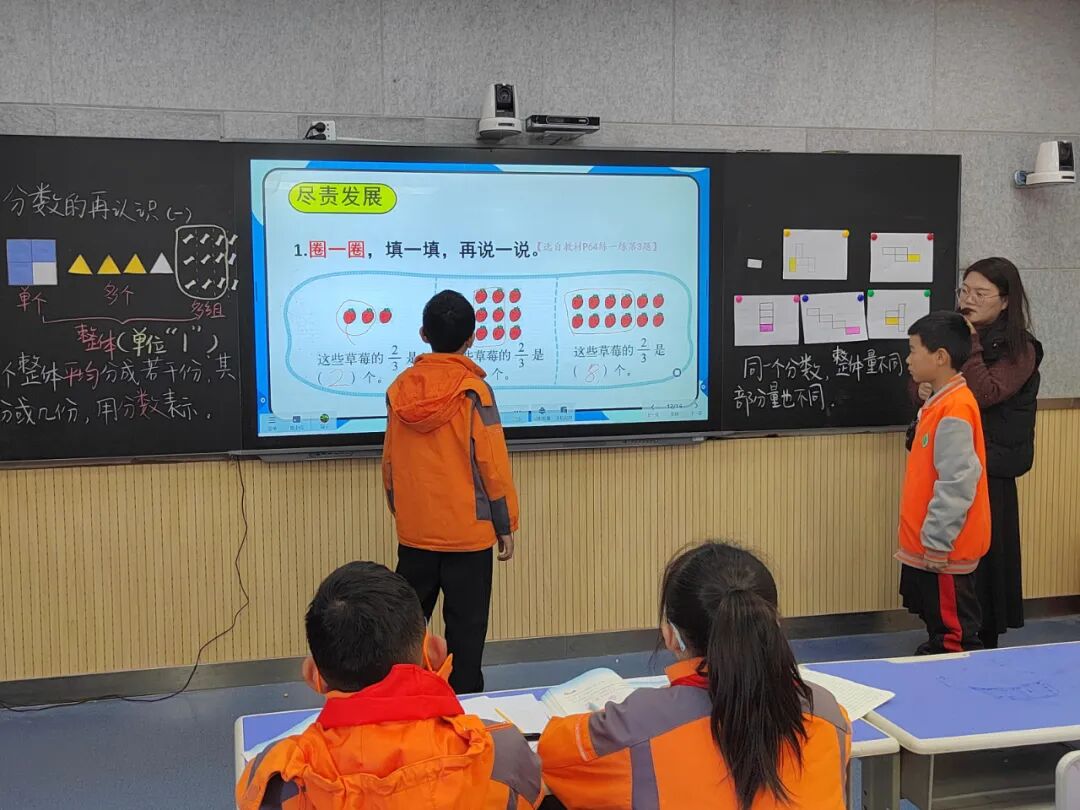 曹文娟老师带来《分数的再认识(一)》一课,以“双责创新课堂”为核心,巧妙融合知识探究与责任素养。通过“画分数—推整体—分小棒”层层递进的趣味活动,精准突破“单位1”认知与分数相对性两大难点。依托小组协作、多元教具及生活化情境,搭配梯度练习与分层作业,让数学知识在实践探究中高效落地。