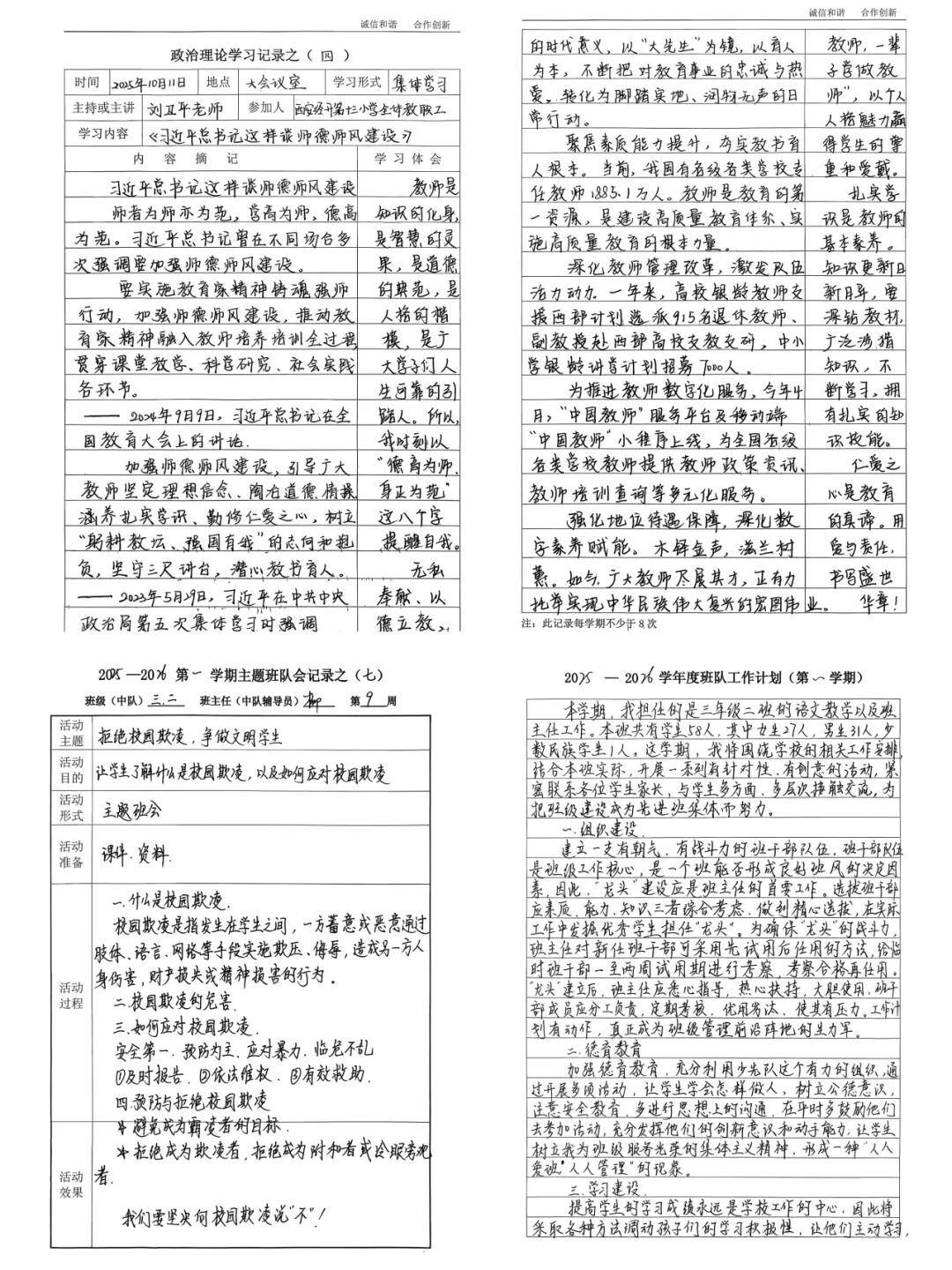各类表册及手册的填写直接反映了教师日常教学工作的落实成效,从检查可以看出表册填写全面规范、翔实具体,图文并茂地展现了教师在教学实施、教研提升、班级管理、社团指导等各环节的扎实工作,体现了教师严谨务实的工作态度与较强的责任意识,校领导对此给予了充分肯定。