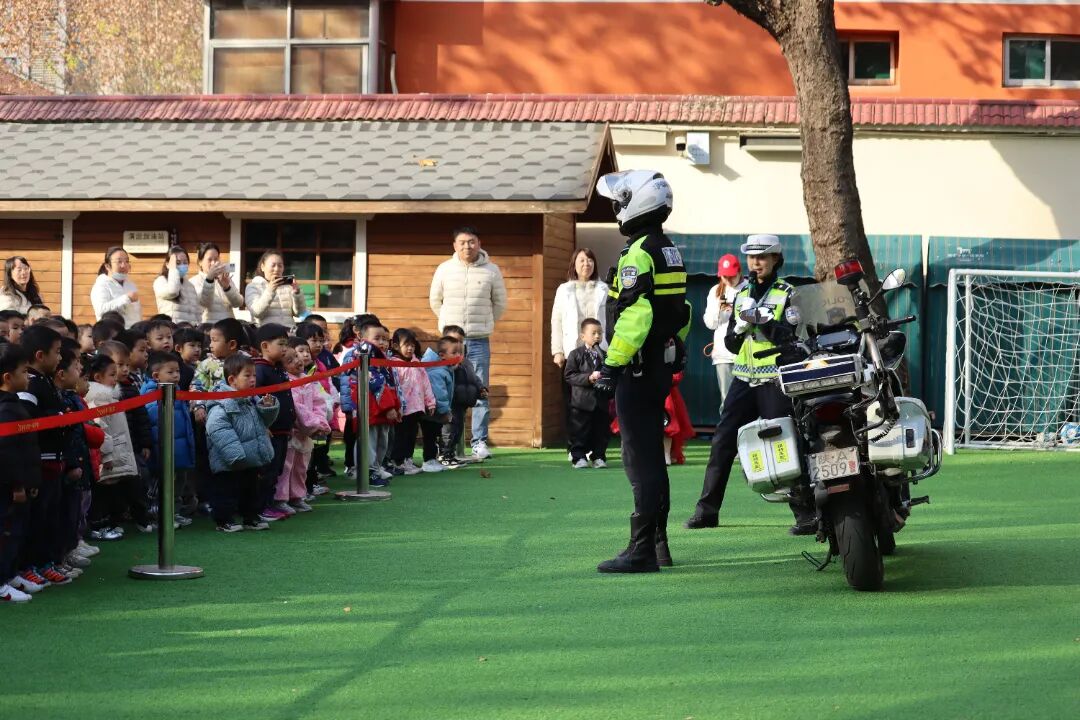 随后,民警带领孩子们传唱交通安全拍手谣,欢快的节奏回荡在校园,朗朗上口的歌词让交通安全知识“声”入人心。正当活动氛围热烈时,民警驾驶警用摩托车帅气亮相,酷炫的外观瞬间点燃全场热情,孩子们的欢呼声此起彼伏。他不仅生动地向孩子们展示了平时执勤需要用到的单警装备,还模拟起了使用单警装备的场景,有趣的活动让孩子们对交警职业充满了无限向往,纷纷举起小手喊出“我长大后也要当交警”的纯真愿望。