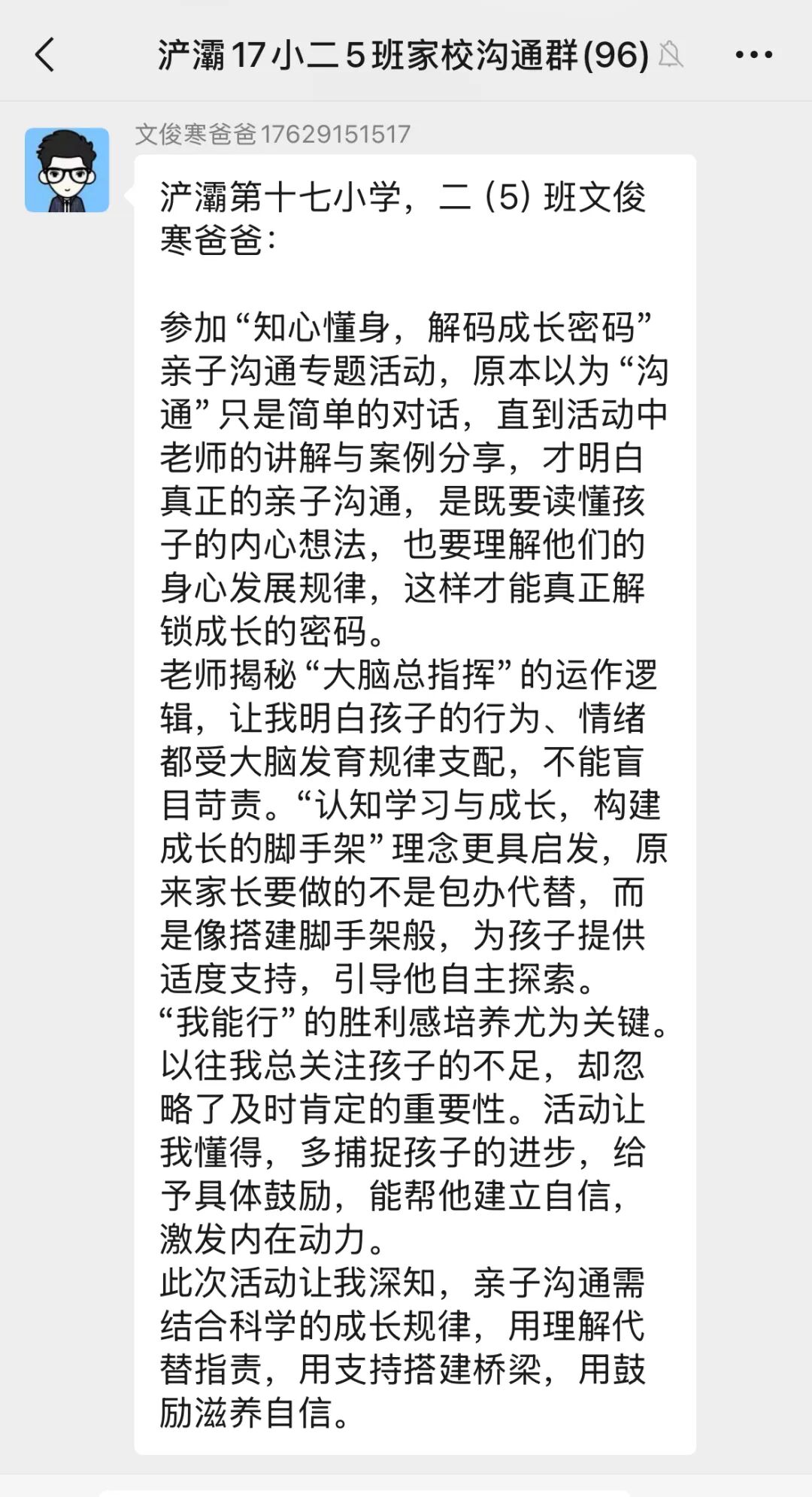 讲座过程中,家长们认真聆听、积极思考,不少家长细致记录要点,现场学习氛围浓厚。讲座结束后,家长们纷纷在年级及班级群中发表百字以上的学习感悟,分享收获与启发,形成了良好的互动反馈机制。