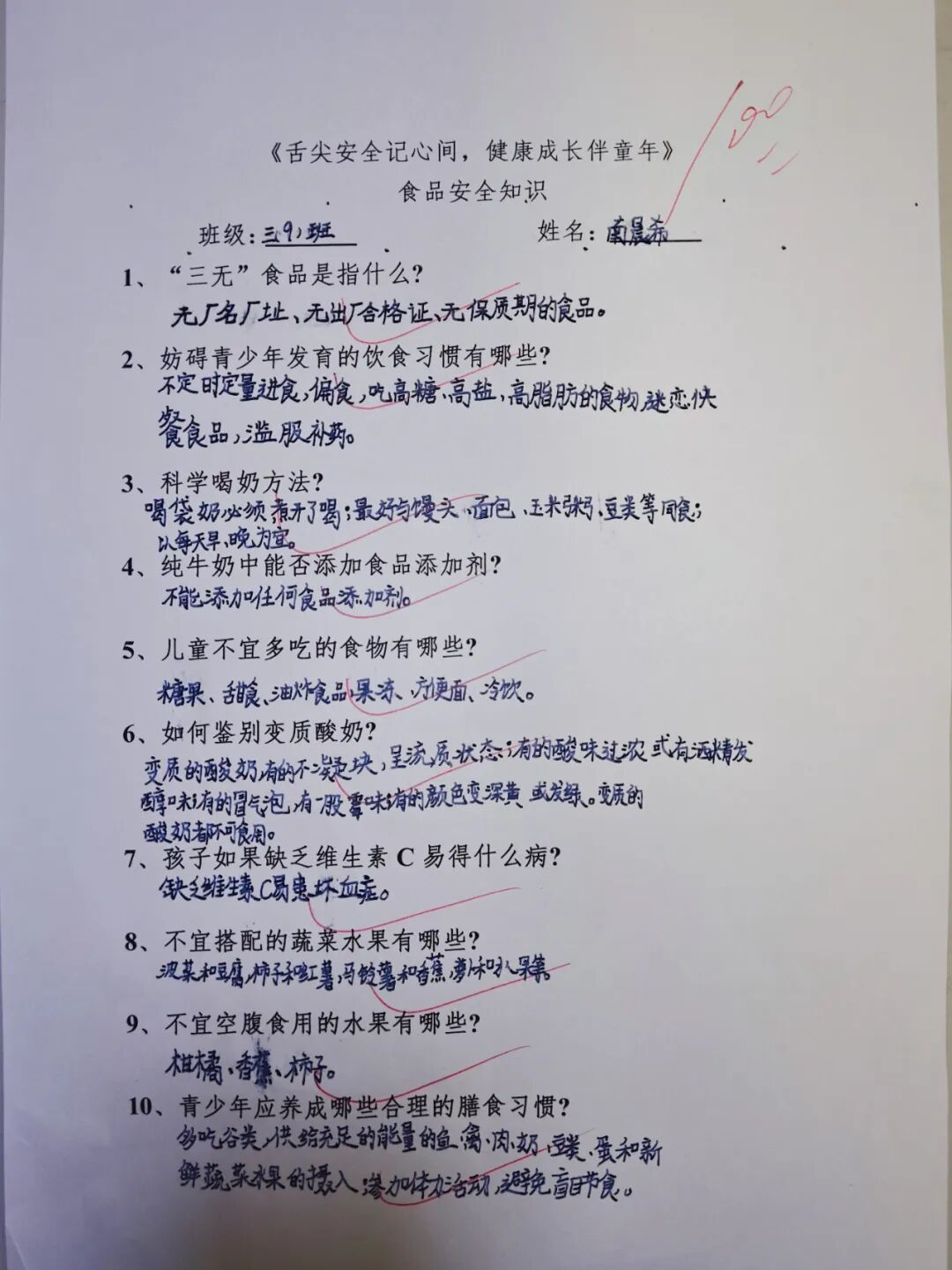 为推动食品安全教育,年级组进行了“食品安全知识答题”活动。答题内容涵盖饮食卫生、科学饮食方法、如何鉴别变质物品及购买食品、常见饮食误区等,在答题过程中增进了学生对食品安全知识的了解。通过答题活动,学生学到了实用的食品安全知识。