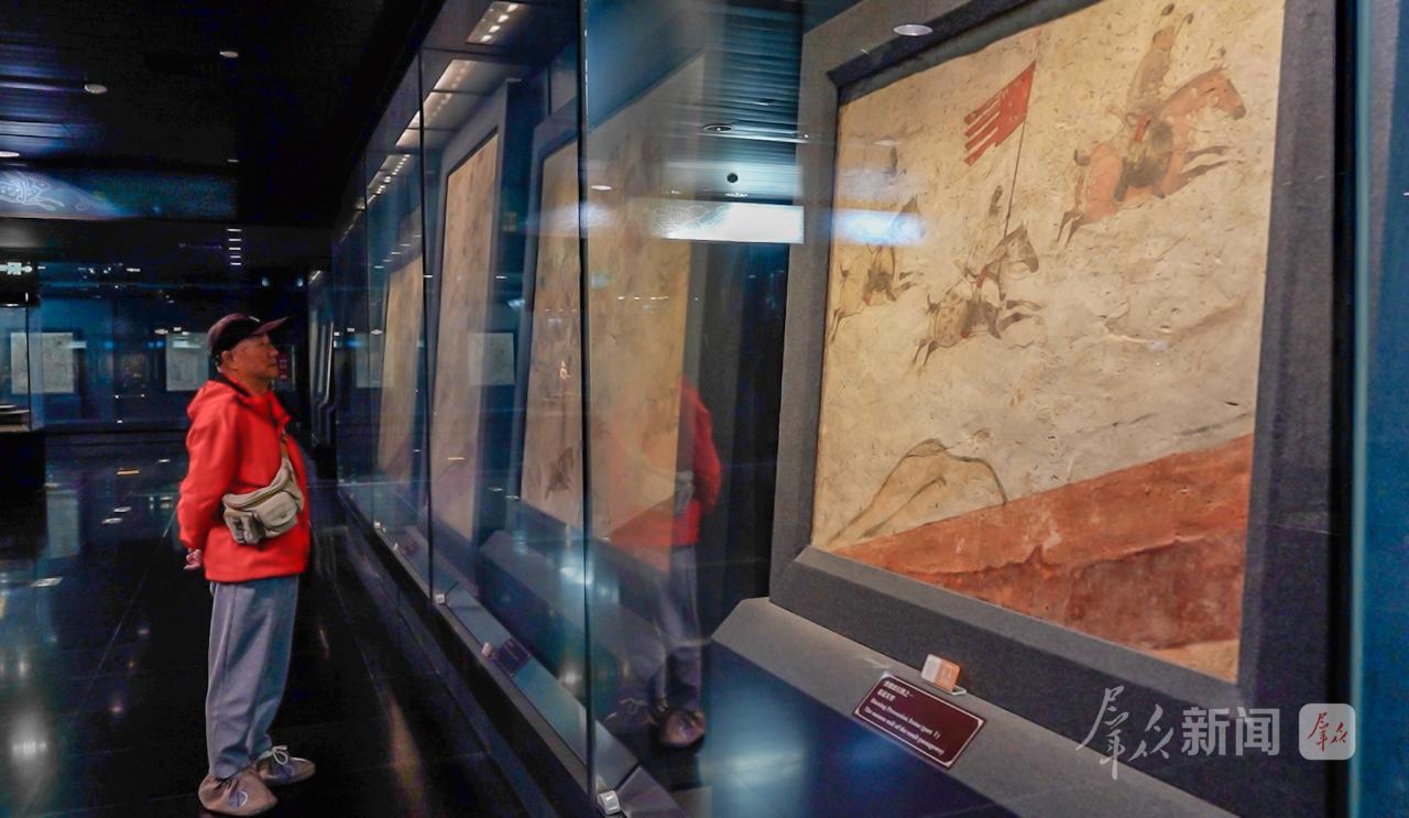 《马球图》里的骑手挥杆疾驰,《观鸟捕蝉图》中宫女的衣袖随风轻摆,《阙楼仪仗图》里巍峨的阙楼下,盛大的仪仗队列庄严肃立……步入“唐代壁画珍品展”以及“壁上丹青盛唐气象——唐韩休墓壁画考古发掘与保护展”展厅内,一幅幅壁画仿佛被重新注入生命。
