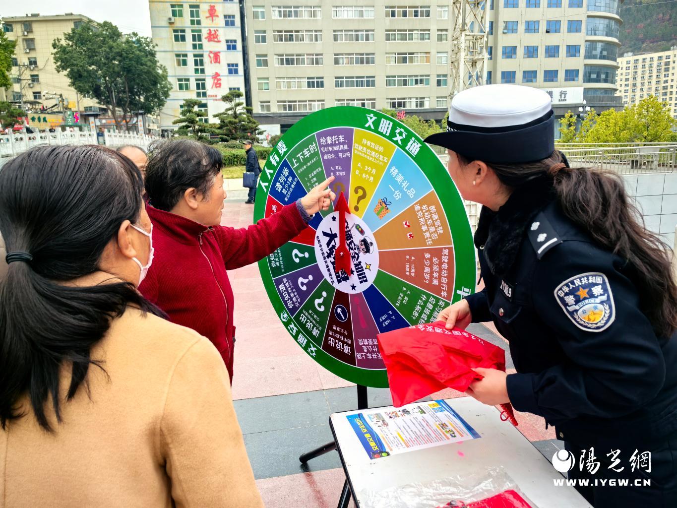 有奖竞答环节堪称现场“流量密码”,印着交通标志和安全知识题目的旋转大转盘刚一亮相,就围满了男女老少。转盘上的问题从行人“一停二看三通过”的过马路规则、机动车停放的具体要求,到酒驾醉驾的法律后果、乘车系安全带的重要性等日常出行必备知识应有尽有。“转盘转到哪题答哪题,答对就有交通安全主题小礼品!”随着民警的介绍,市民们纷纷前来参与,大家也展开了对交通安全知识的学习和讨论。轻松的问答互动中,交通安全知识悄然扎根,现场参与热情持续升温。