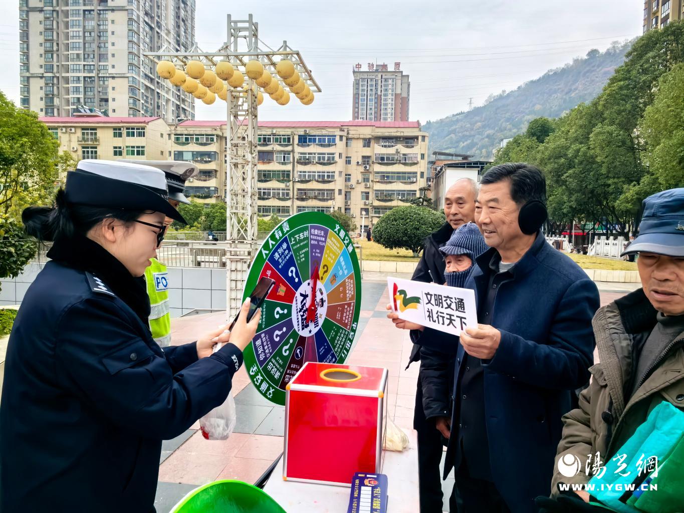 活动伊始,广场中央的宣传展台便成为了焦点。民警们向过往群众递上印有机动车驾驶规范、非机动车通行规则、冬季雨雪天行车技巧等内容的彩色宣传单页。针对冬季出行天干物燥、路面易滑、昼夜温差大易引发疲劳驾驶等特点,民警用“接地气”的方言,详细讲解酒驾醉驾、超速超员、闯红灯、骑乘电动车不按规定佩戴安全头盔等交通违法行为的严重危害,让安全知识听得懂、记得牢。