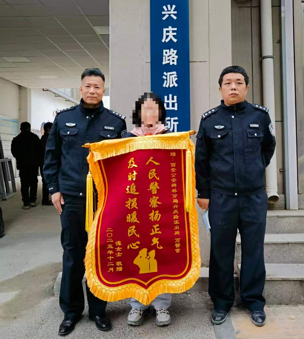 阳光讯(记者 熊玺 文/图)2025年12月2日上午,谭女士手持一面印有“人民警察扬正气,及时追损暖民心”的锦旗,专程赶到公安碑林分局兴庆路派出所,并亲手交到民警手中。锦旗上的这十四个字,承载着她对民警历时数月、跨省追赃的深深谢意,也见证了民警尽职履责、为民挽损的决心和担当。