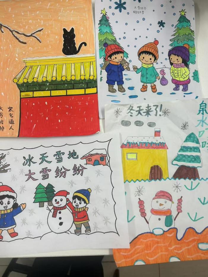 三年级同学开启“冬日成语探寻之旅”,搜集与冬天相关的成语后,挑选喜爱的成语进行创作。他们拿起画笔,将“冰天雪地”的壮阔、“雪中送炭”的温暖画于纸上,让抽象的成语变得直观鲜活,在绘画中加深了对成语的理解与记忆。