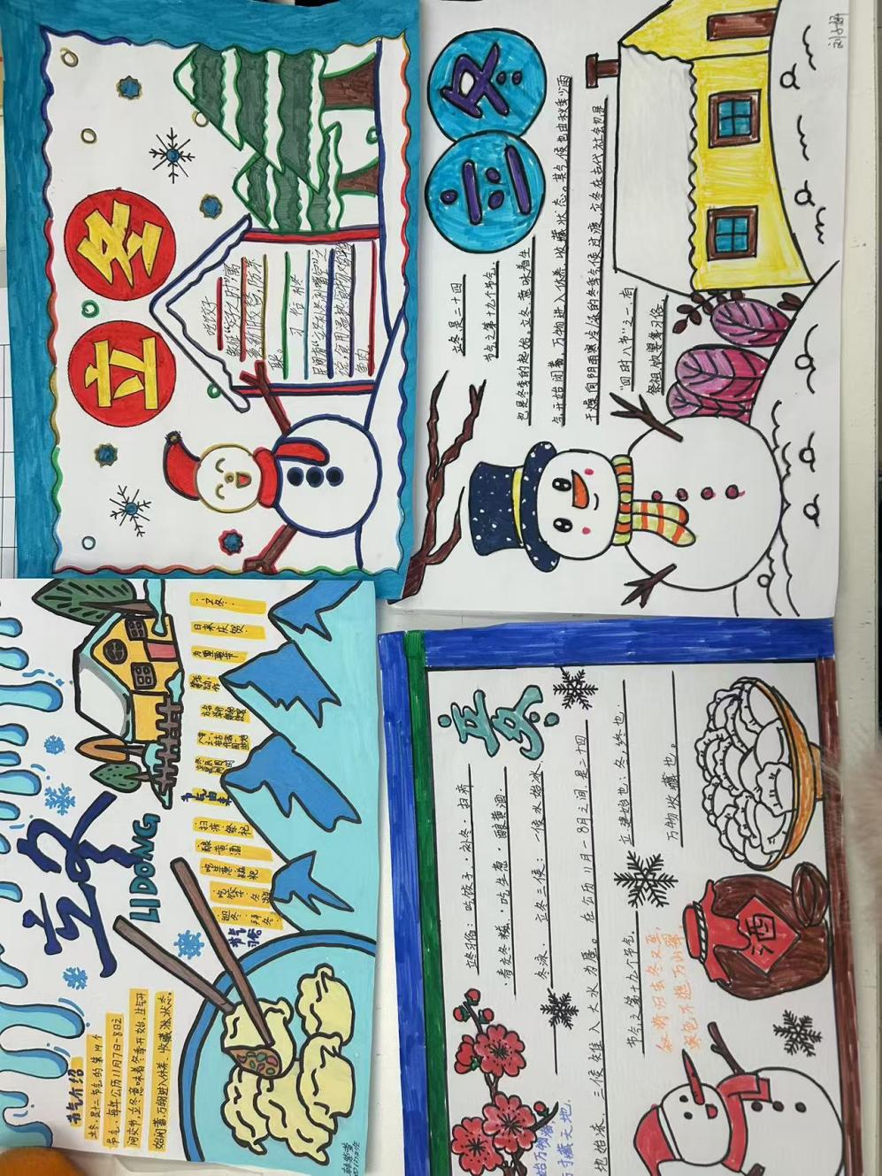 四年级同学围绕“立冬”节气展开深入探究,通过查阅书籍、搜索网络,了解立冬“水始冰、地始冻、雉入大水为蜃”的三候知识,以及吃饺子、酿黄酒等传统习俗与饮食文化。之后,他们制作出《立冬节气知多少》手抄报,图文并茂地呈现研究成果,尽显节气文化的魅力。