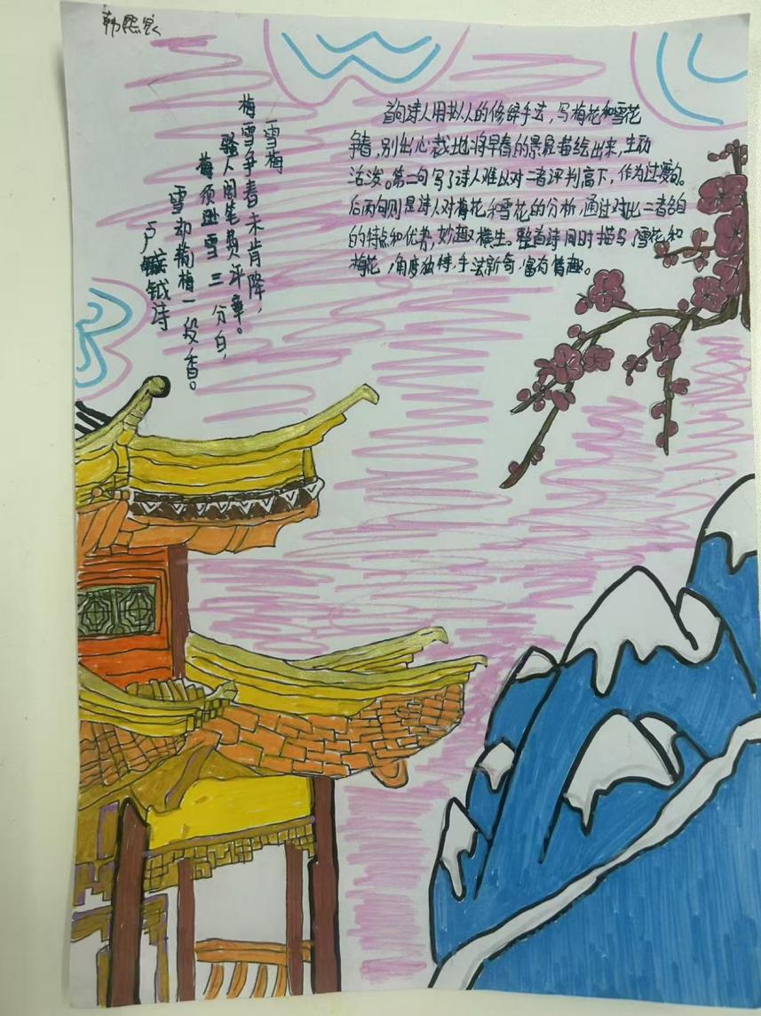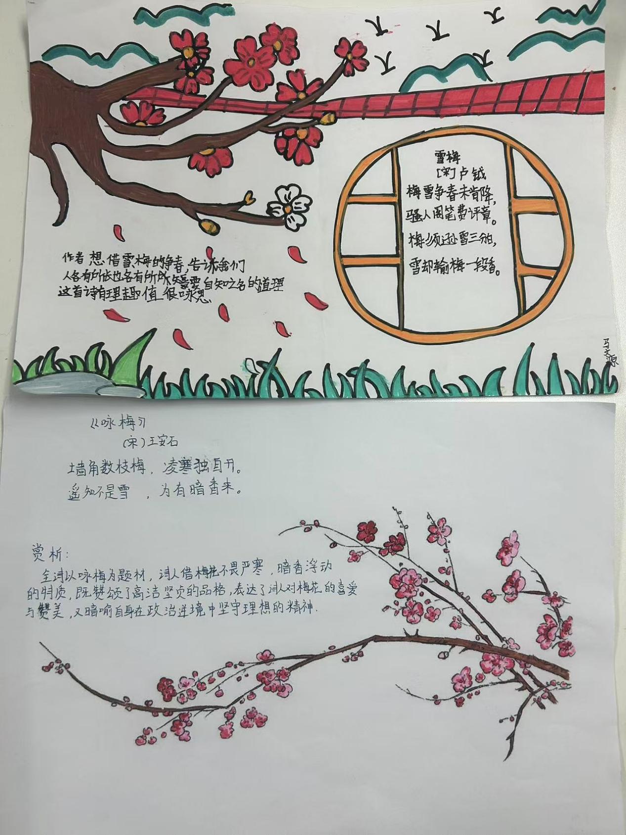 五年级同学走进古诗中的冬日世界,从诗作中感受冬的意境。他们为喜爱的古诗配上水墨丹青,或画孤舟独钓,或绘傲雪寒梅,还写下古诗赏析,字里行间满是对古典诗词的感悟与热爱。
