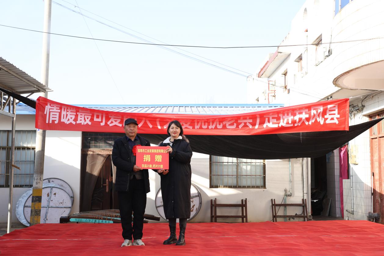 活动现场,气氛热烈而庄重。在简短而温馨的捐赠仪式上,宝鸡上善公益联合会常务副会长曹亚军代表主办方为老兵们送上了包含相框、棉被、四件套、血压仪等物品的爱心包及每人500元帮扶金。宝鸡市工业发展集团有限公司西北区域销售总监张冬梅代表捐赠单位上台,为老兵们捐赠了饮品和钙片,并为志愿者捐赠了爱心饮品。张冬梅表示:“老英雄们是国家和民族的脊梁,为我们创造了今天的幸福生活。市工发集团始终秉持社会责任,希望通过这份微薄之力,向老英雄们表达敬意与关爱,为他们的晚年生活增添一份温暖。未来,我们将继续积极投身公益事业,传递社会正能量。”