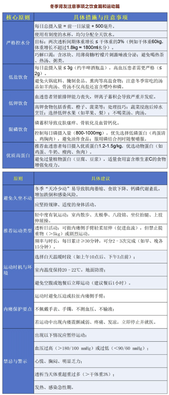 那么,肾友冬季该如何安全进补,维持一个良好的干体重?何萍主任表示,除此之外,肾友们一定要需重点关注这三大方面。一是透析通路保护。动静脉内瘘是生命线,冬季血管易收缩,应避免内瘘侧手臂受压、受凉或负重,每日检查震颤情况,发现异常及时就医;透析后24小时内保持穿刺部位干燥,导管患者须防冷水刺激以防感染;二是坚持适度活动与规律作息。避免因天冷久坐不动,可选择室内散步、八段锦等轻中度运动,每日累计30分钟以上,以维持肌肉力量和代谢平衡;同时保证23点前入睡、睡足7–8小时,并关注情绪变化,多晒太阳、交流互动,预防冬季抑郁;