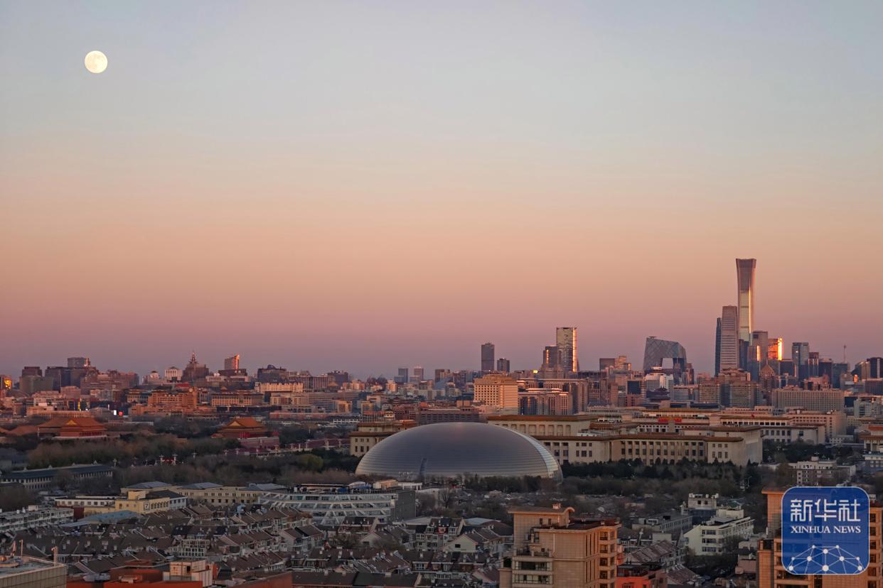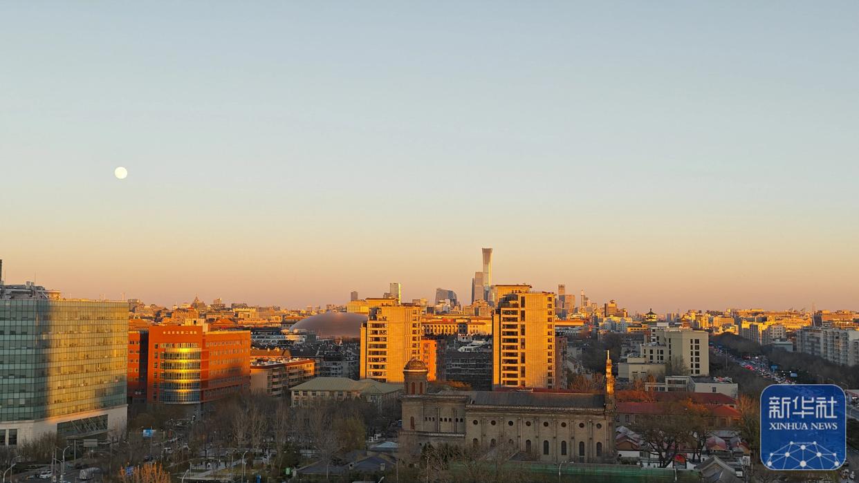 ↑ 这是12月4日在北京宣武门附近拍摄的月亮与城市景观(手机照片)。新华社记者 张铖 摄