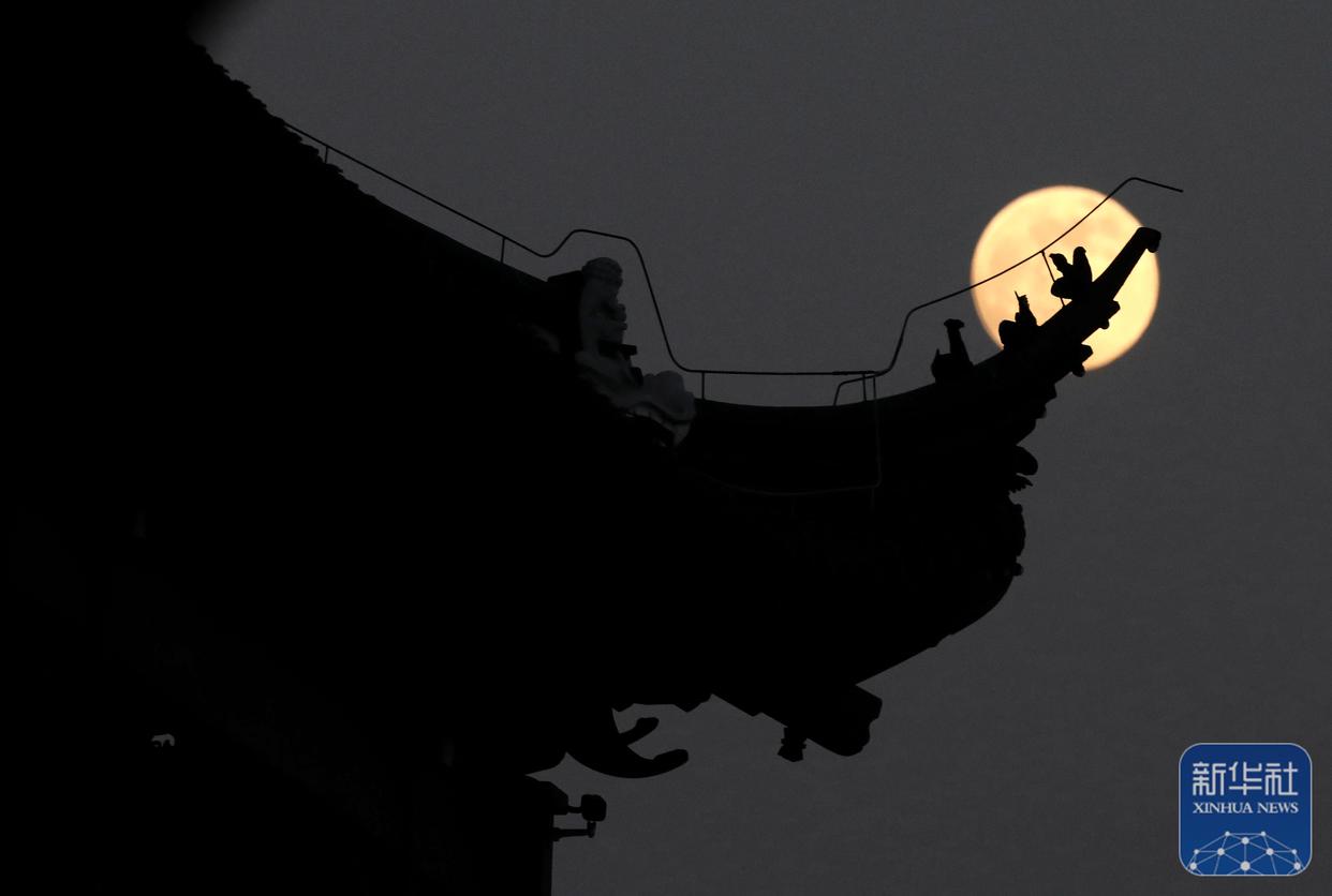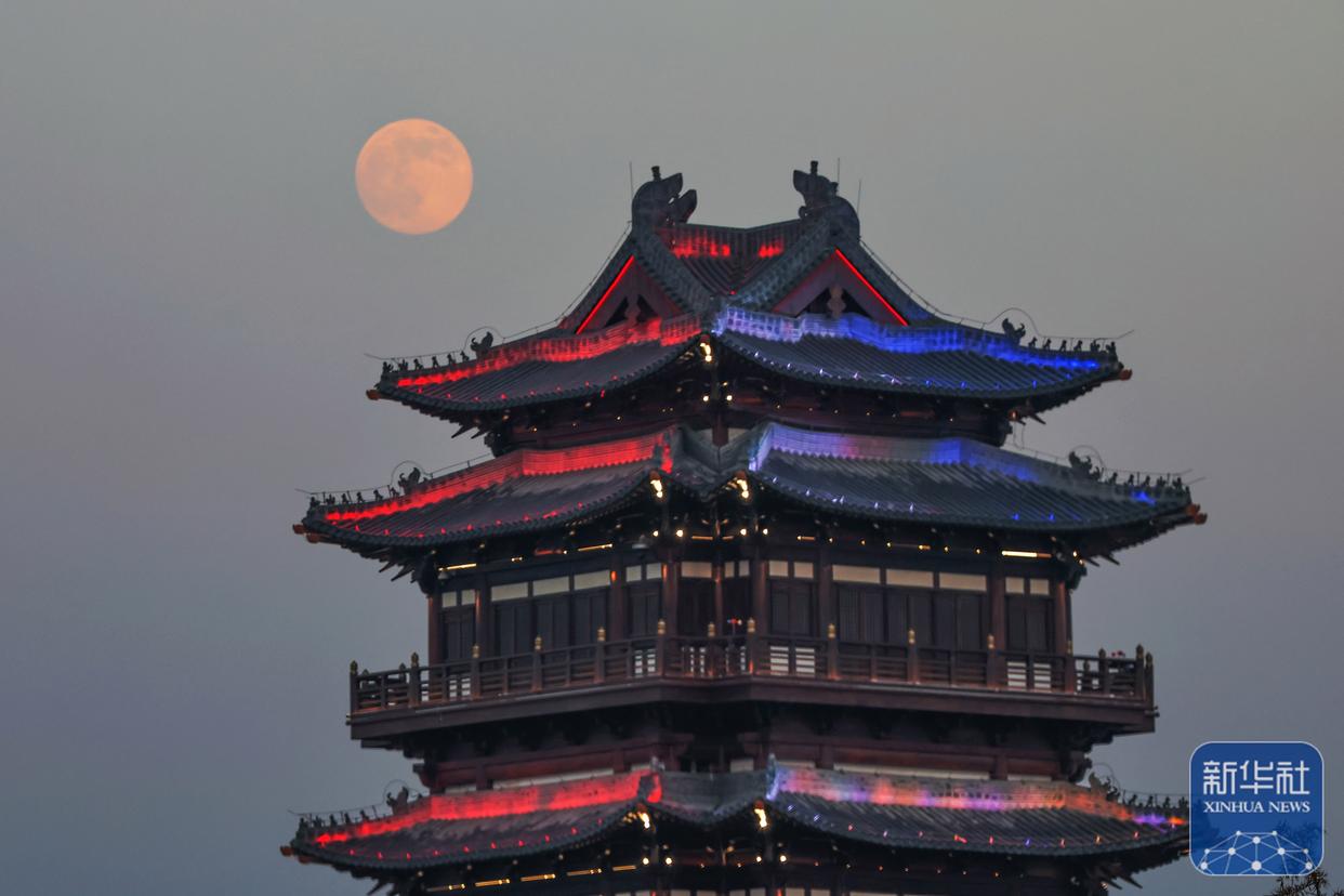 ↑ 12月4日拍摄的江苏省苏州市平门城楼和月亮。新华社发(杭兴微摄)
