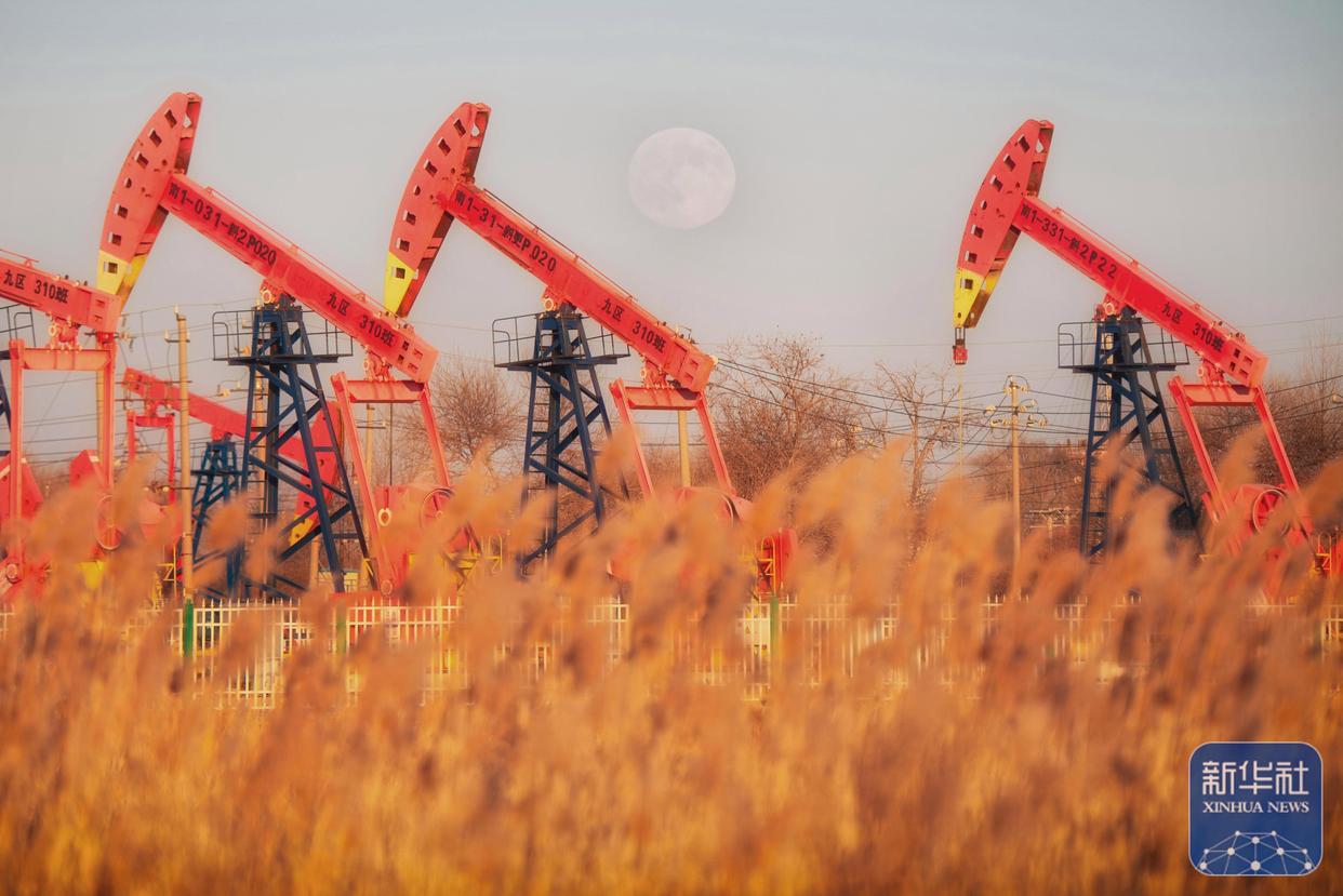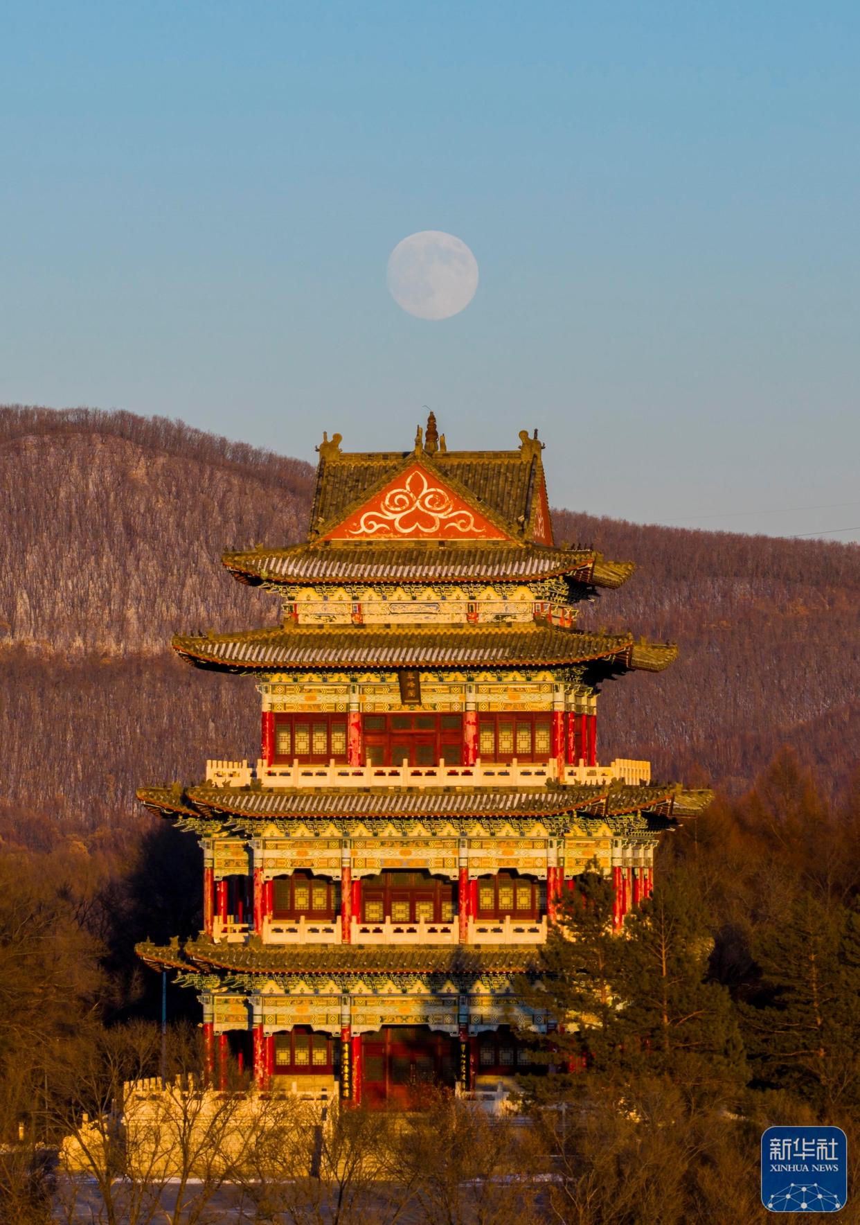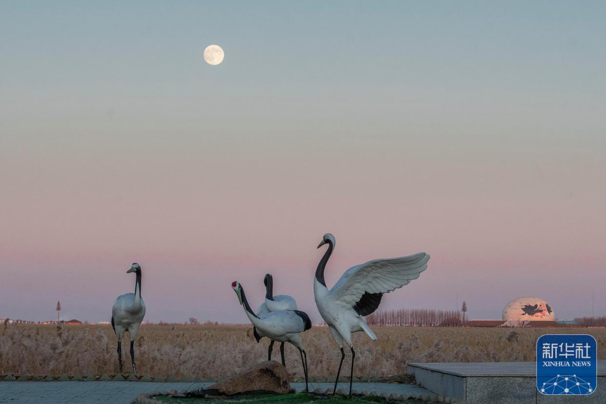 ↑ 12月4日在位于黑龙江省齐齐哈尔市的扎龙国家级自然保护区拍摄的月亮。新华社发(王勇刚摄)