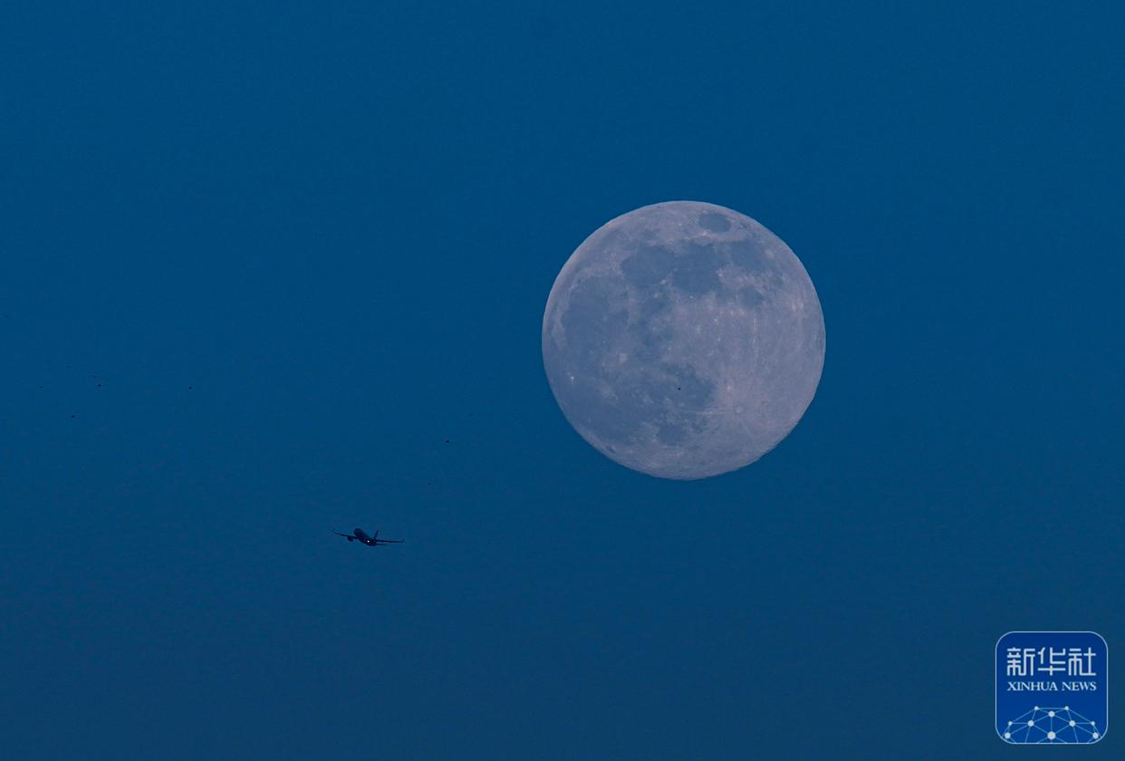 ↑ 12月4日在浙江省温州市上空拍摄的月亮和飞机。新华社发(苏巧将摄)