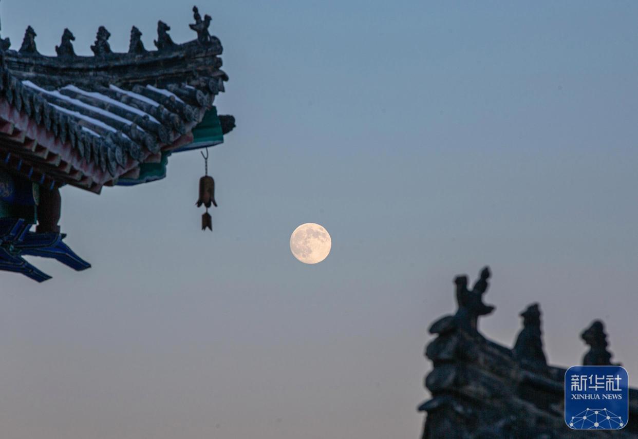 ↑ 12月4日在北京宣武门附近拍摄的月亮与一处建筑。新华社记者 张铖 摄