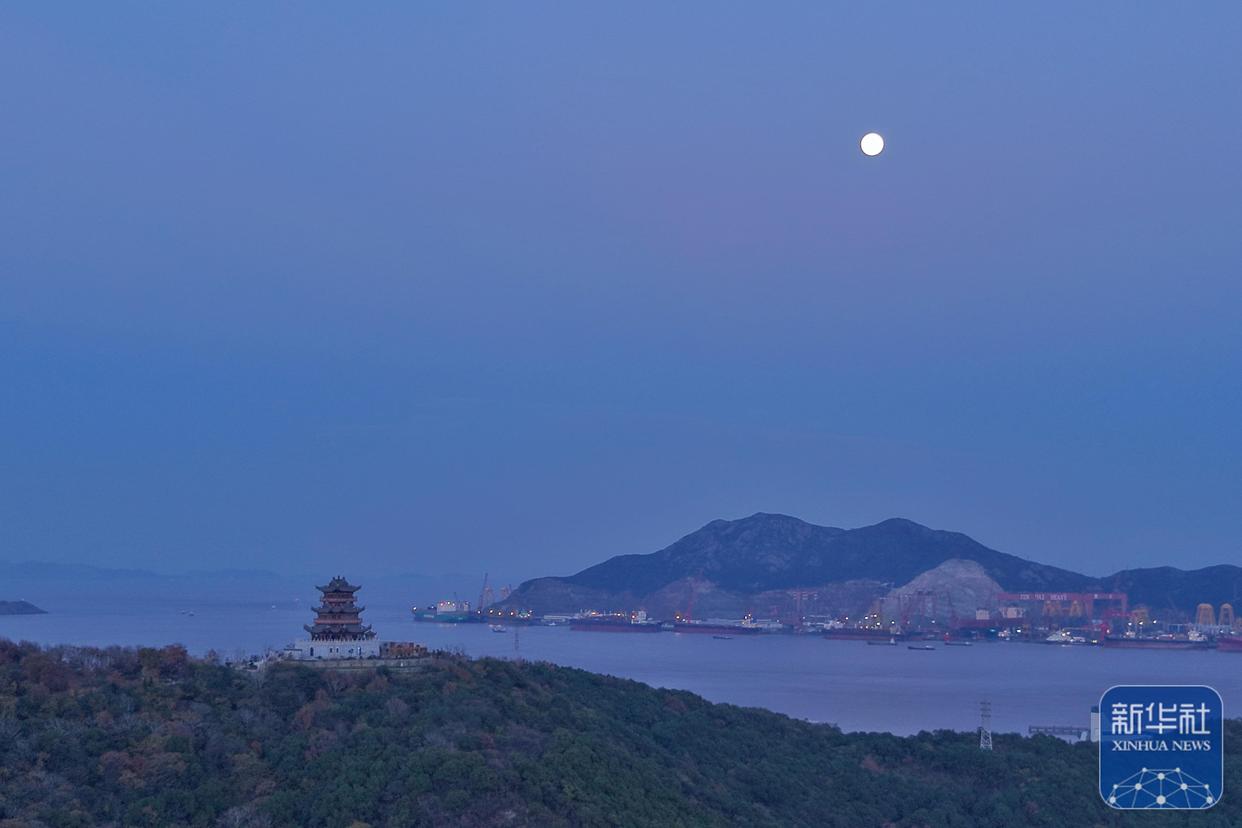 ↑ 12月4日在浙江省舟山市岱山县高亭港拍摄的月亮。新华社发(邢守秒摄)