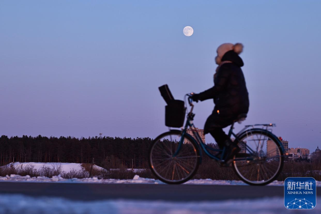 ↑ 12月4日,在黑龙江省同江市,一位市民在月下骑行。新华社发(刘万平摄)