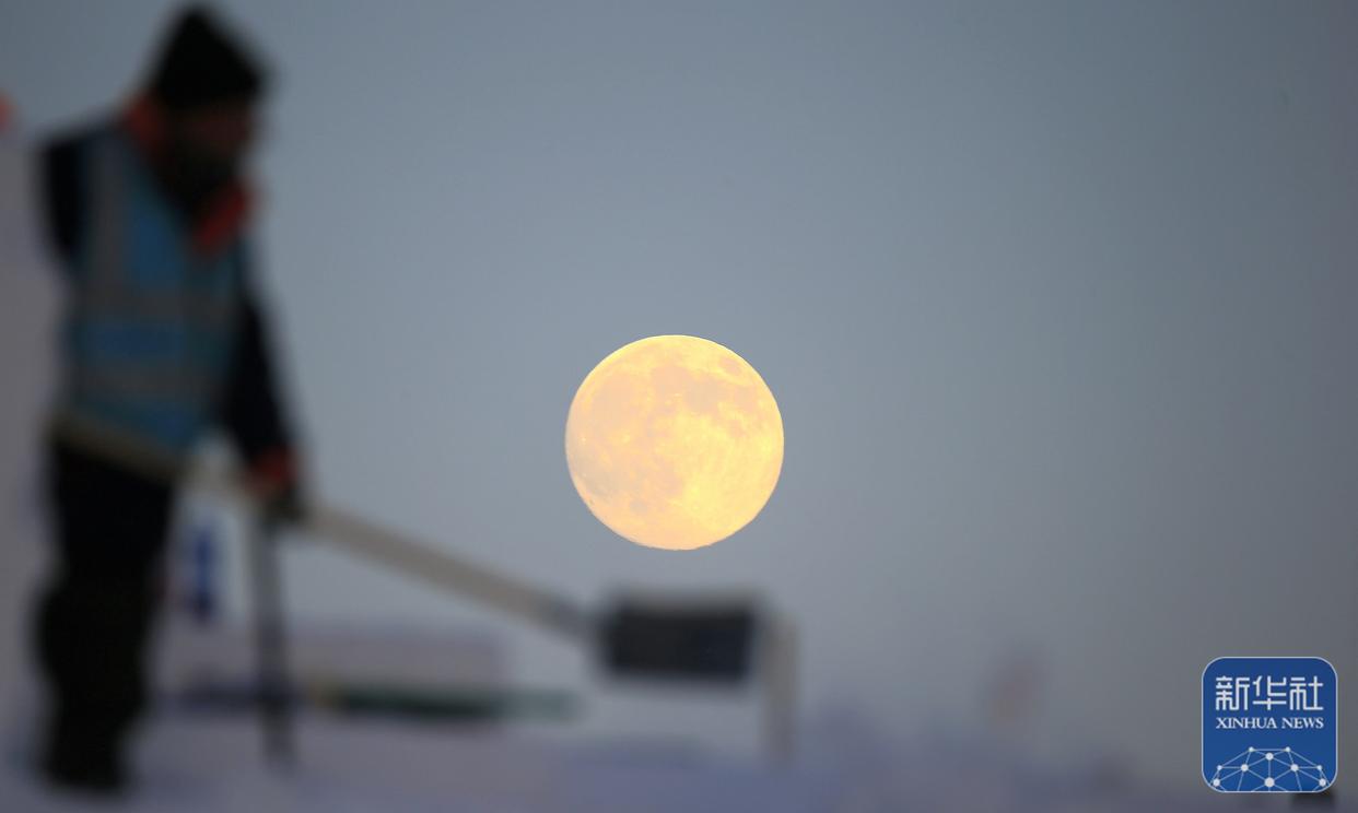 ↑ 12月4日在哈尔滨市太阳岛雪博会建设现场拍摄的月亮。新华社发(张树摄)